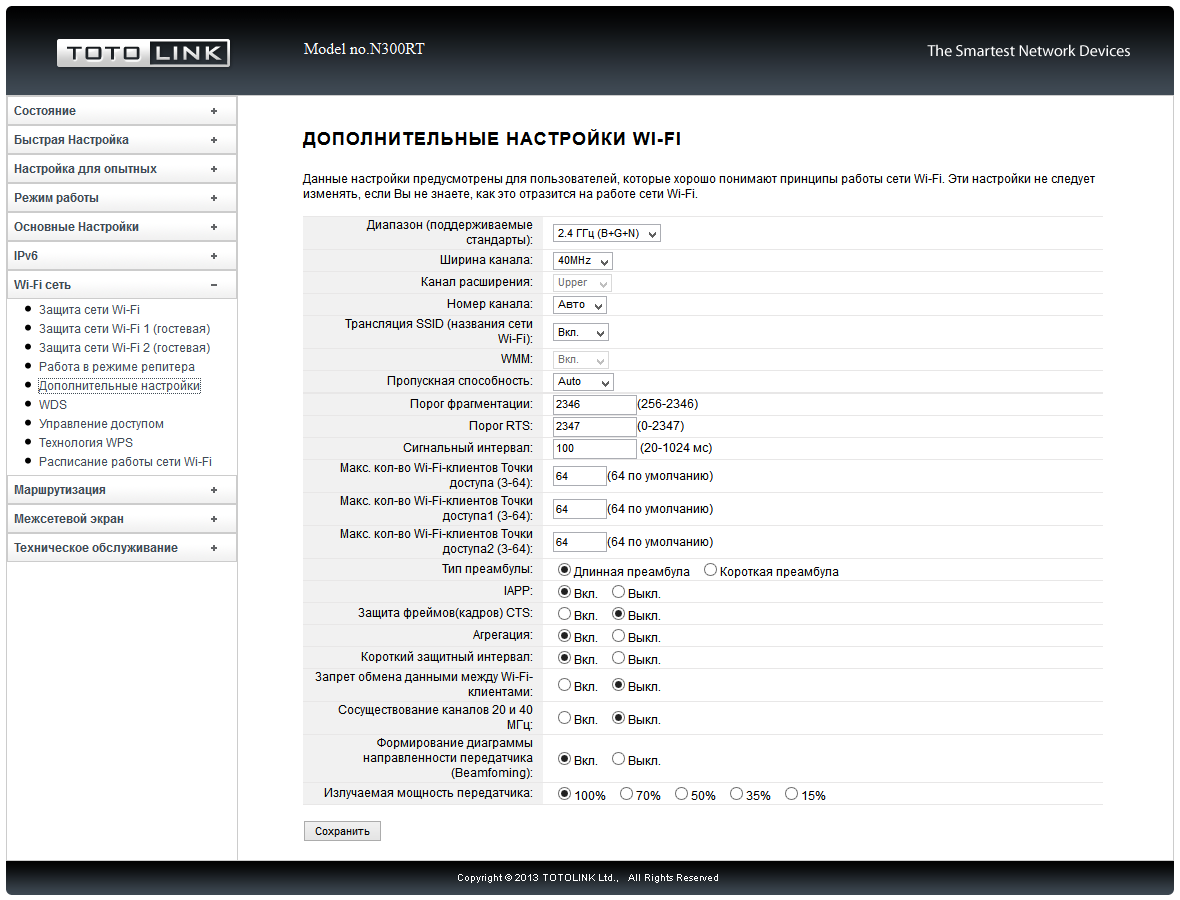 Кроме изменения имени беспроводной сети и параметров защиты, пользователь может выбрать поддерживаемые стандарты, номер и ширину канала, отключить трансляцию имени сети, ограничить число подключаемых беспроводных клиентов, изменить мощность передаваемого сигнала (пять позиций), а также установить несколько служебных параметров беспроводной точки доступа.