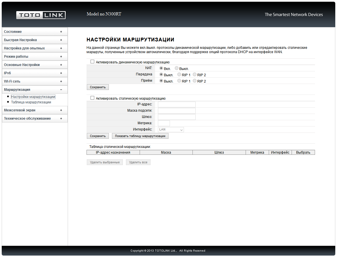 Роутер поддерживает динамическую маршрутизацию RIP и имеет возможность добавления в таблицу собственных статических маршрутов. Предусмотрен просмотр текущей версии таблицы, а также отключение NAT.