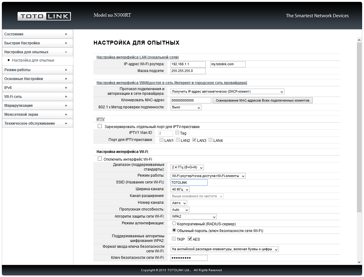 «Быстрая настройка» предлагает использовать несколько шагов помощника для установки основных параметров работы устройства. «Настройка для опытных» имеет аналогичное назначение, но все опции представлены на одной странице и есть возможность настройки IPTV.