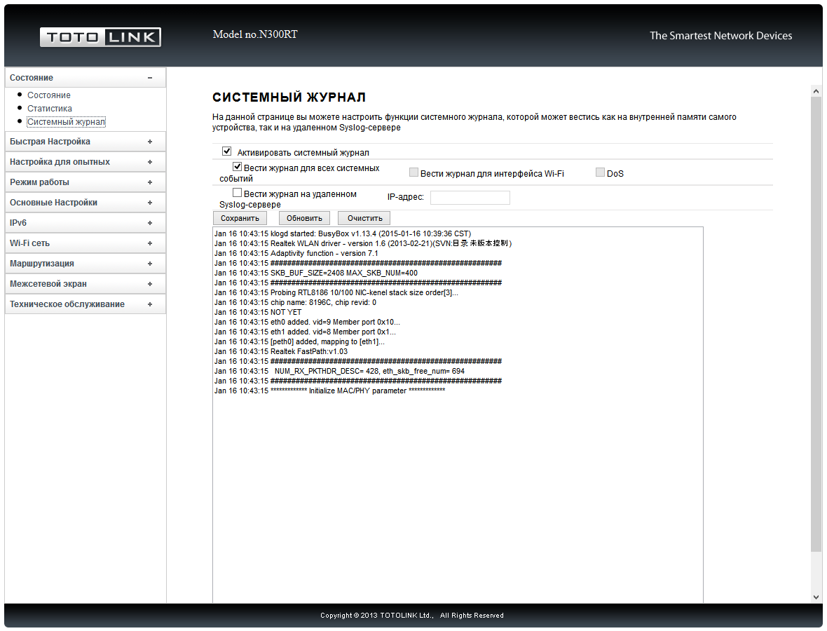 Роутер позволяет посмотреть системный журнал событий, но используемый при выводе фильтр существенно снижает его информативность. Кроме того, есть опция для отправки данных на сервер syslog.