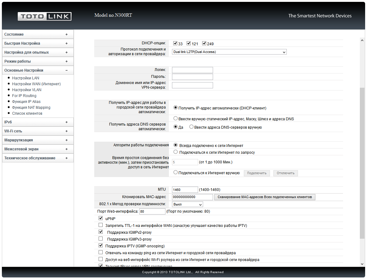 Для подключения к интернету поддерживаются популярные на локальном рынке стандарты — IPoE, PPPoE, PPTP, L2TP и 802.1x. Отметим, что при использовании сервера доступа оператора сохраняется работоспособность и локальной сети провайдера (Dual Access). Роутер имеет встроенный клиент DDNS с тремя предустановленными сервисами. В рассматриваемой версии прошивки также реализована и поддержка IPv6 с DHCPv6 и RADVD. Предусмотрена возможность изменения MAC-адреса порта WAN.