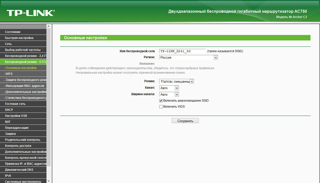 Роутер имеет две беспроводные точки доступа для диапазонов 2,4 ГГц и 5 ГГц, поддерживающие стандарты 802.11b/g/n и 802.11a/n/ac соответственно. Причем есть возможность их независимого отключения. Набор настроек дублируется, так что посмотрим только на один диапазон. Стандартный набор опций включает в себя выбор имени беспроводной сети, региона, режима, номера и ширины канала. Для диапазона 5 ГГц поддерживаются каналы 36—64 и 149—161.