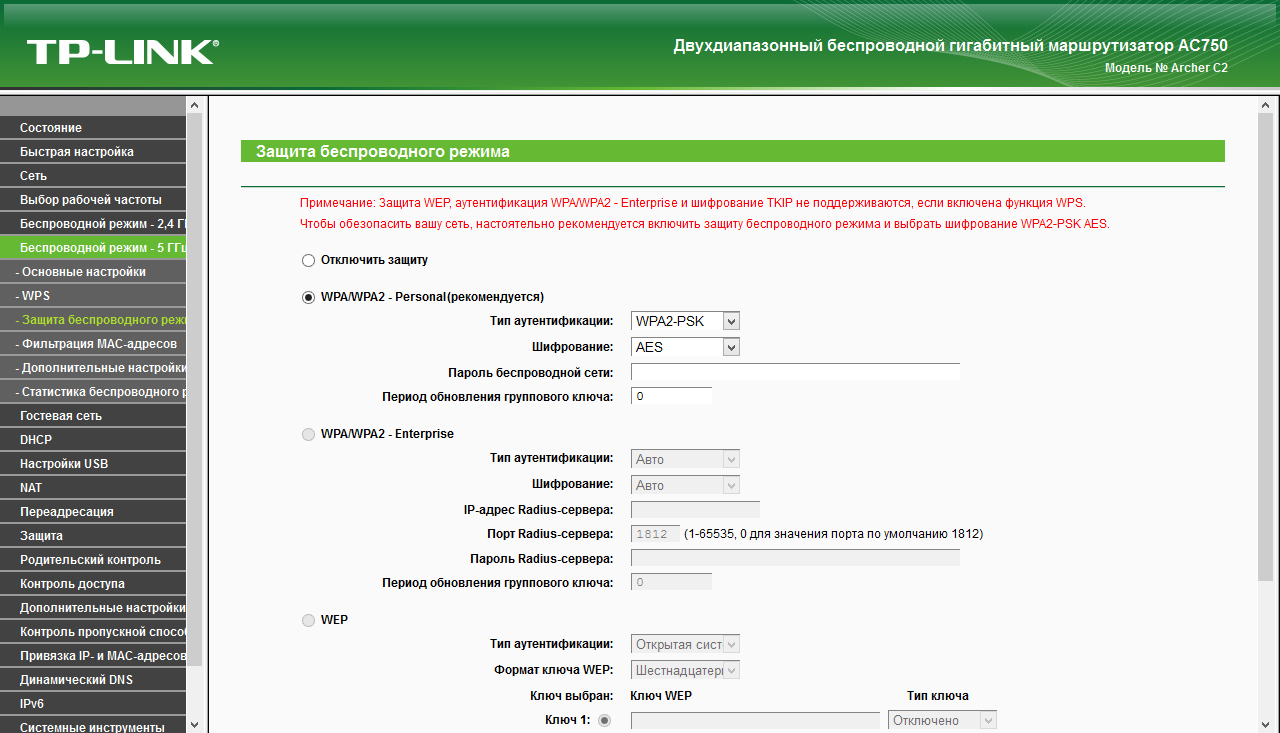 Роутер поддерживает технологию WPS, а в список возможных режимов защиты входят не только WPA/WPA2 с паролем, но их варианты с сервером RADIUS.