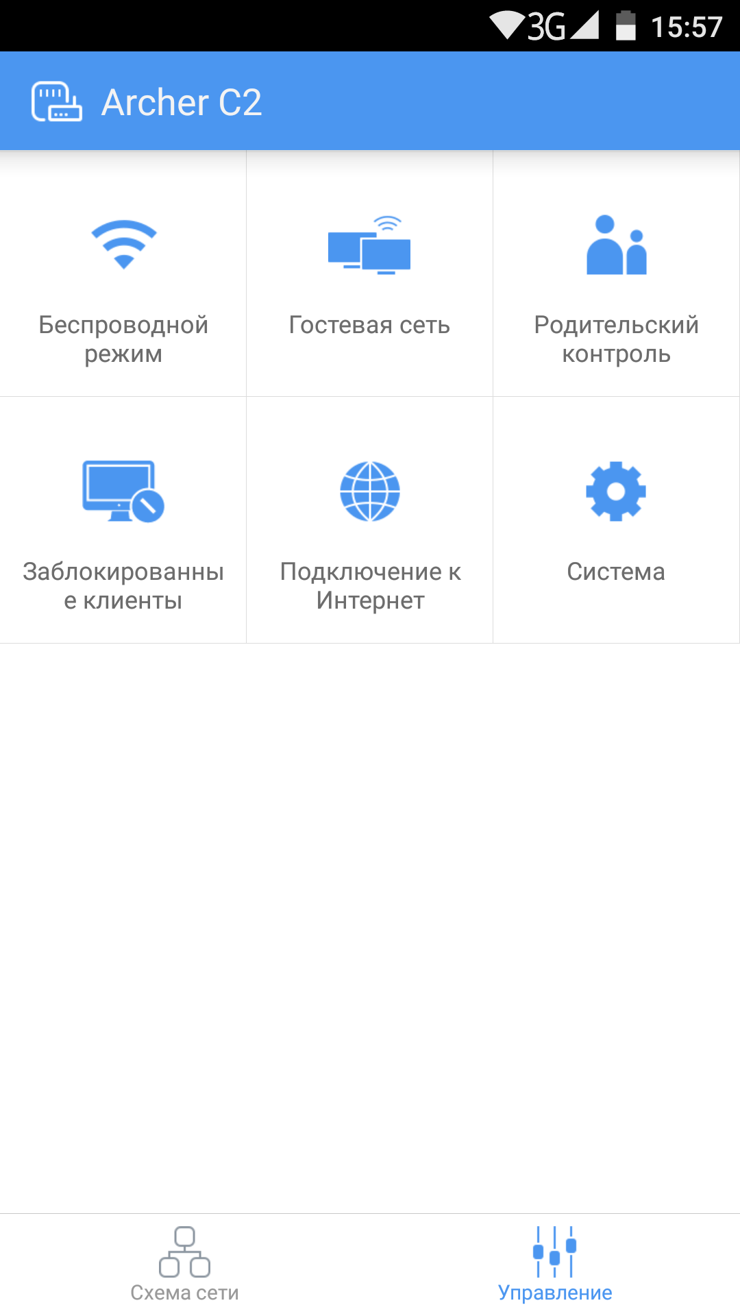 На экране режима настройки присутствуют несколько значков, которых будет достаточно для установки основных параметров работы устройства. В частности, здесь есть выбор опций подключения к интернету, управление беспроводными сетями (включение/отключение сети, изменение имени и пароля), изменение пароля администратора, родительский контроль, перезагрузка и сброс настроек.