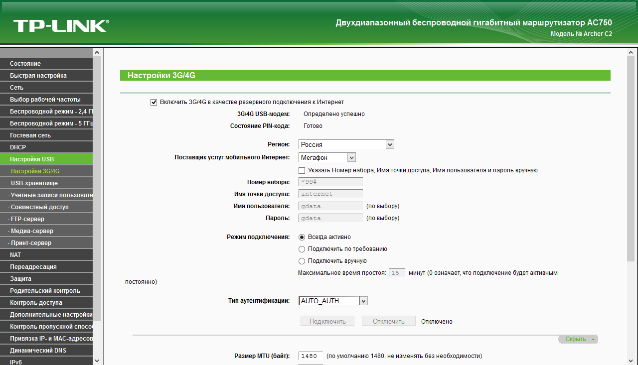 Подключение сотового модема поможет организовать резервный канал в интернет (или основной, если не подключать кабель). Список совместимых моделей приводится на сайте. В него входят как устройства прошлых поколений для сетей 3G, так и некоторые современные модемы с поддержкой 4G и быстрых программных интерфейсов. В частности, с Huawei E392 и московским оператором Мегафон мы получили скорость более 40 Мбит/с в обе стороны.