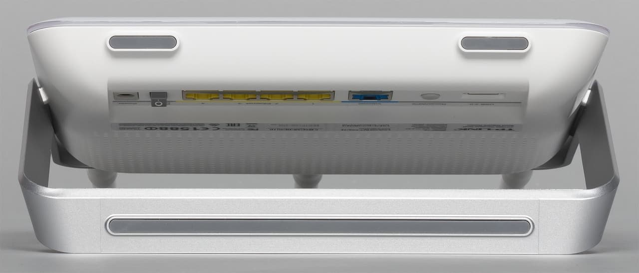 Для обеспечения устойчивости есть специальная ножка из серебристого пластика, в верхней части роутера переходящая в рамку.