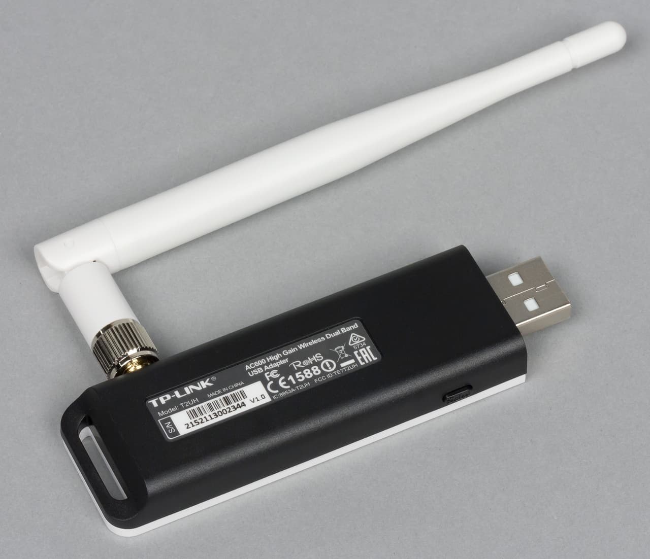 Корпус адаптера изготовлен из пластика. Верхняя часть и антенна белые, вторая половина черная. На противоположном разъему USB торце есть «петля», которая может пригодиться для крепления адаптера.