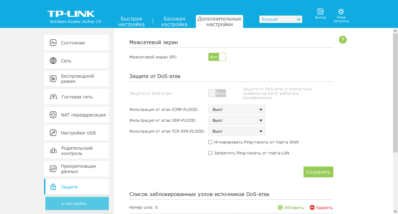 Для защиты сети пользователя в роутере предусмотрены межсетевой экран SPI и модуль фильтрации пакетов при DoS-атаках. Функция контроля доступа позволяет заблокировать клиентов по их MAC-адресам, что может быть использовано, например, для запрета подключения к беспроводным сетям.