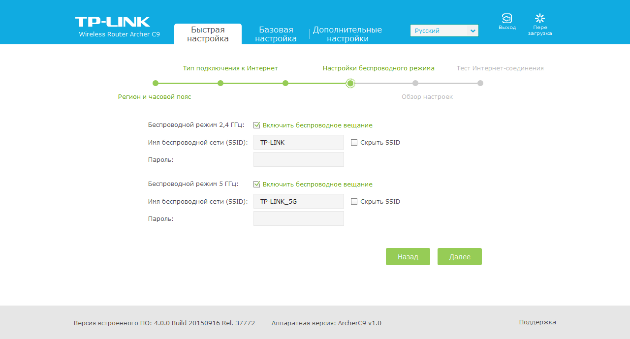 Роутер имеет локализованный веб-интерфейс, представленный в трех вариантах. Самый простой называется «Быстрая настройка» и запускается автоматически при первом включении. В нем вы указываете параметры подключения к интернету, имена и пароли беспроводных сетей, а также новый пароль администратора и часовой пояс.