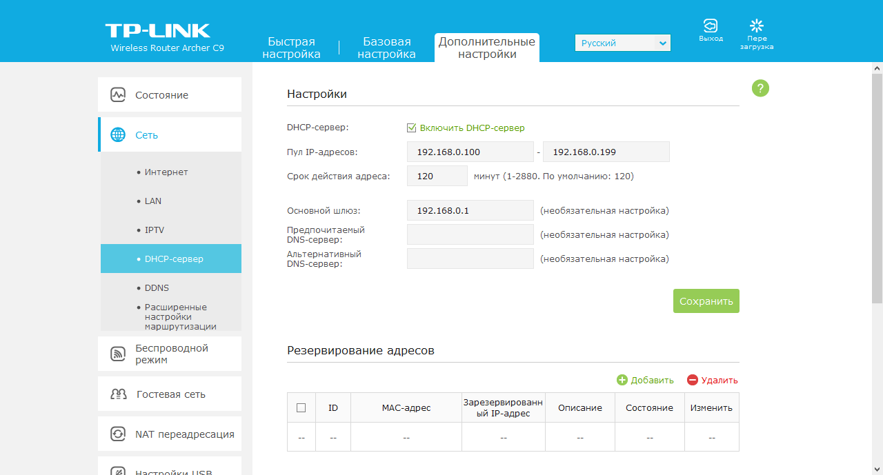 Для обслуживания клиентов локальной сети в роутере установлен сервер DHCP. Из дополнительных его настроек отметим возможность резервирования адресов.