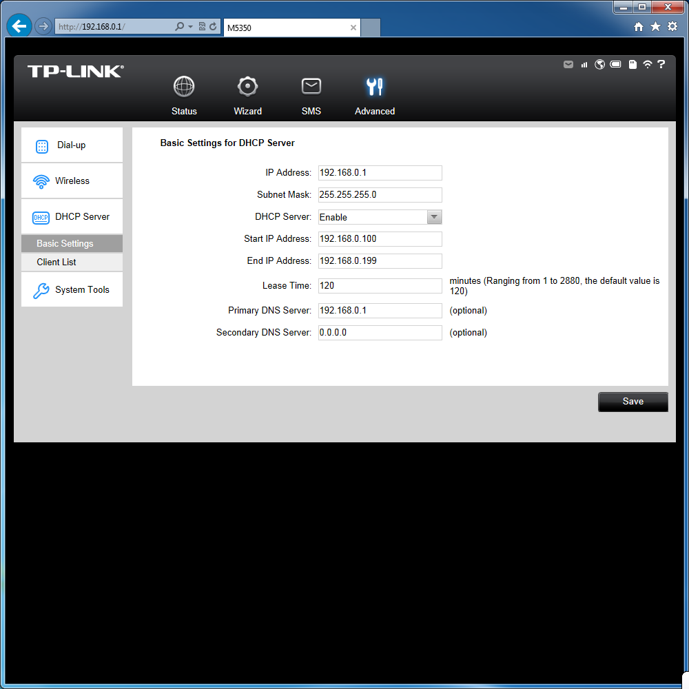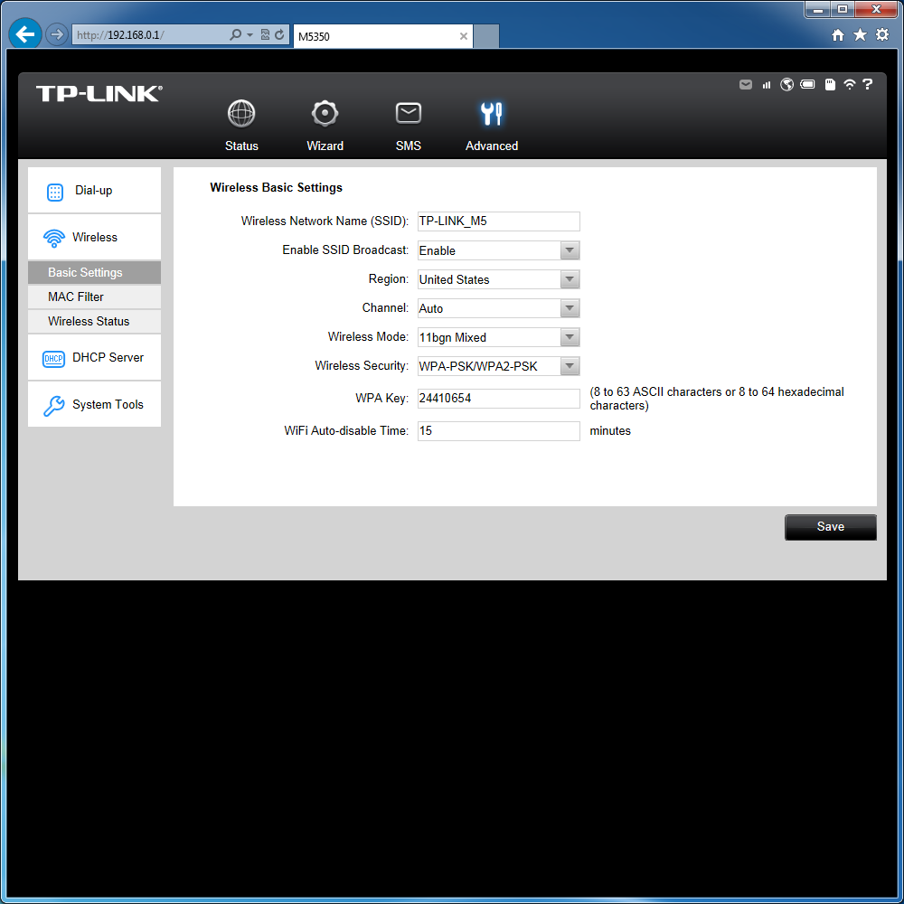 Набор настроек беспроводной сети стандартен: регион, имя сети, номер канала, режим, защита. Из полезных дополнений упомянем возможность отключения беспроводного модуля по тайм-ауту при отсутствии активных клиентов, что позволяет сэкономить заряд батареи. Присутствует фильтр MAC-адресов на 10 записей и страница со списком текущих клиентов с указанием их MAC-адресов.