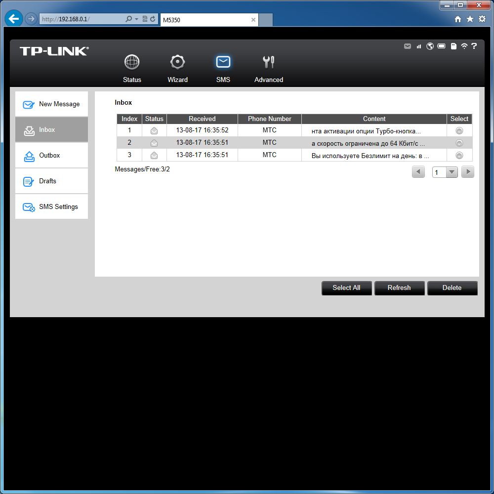 Присутствует возможность работы с SMS-сообщениями, что может быть полезно для изменения тарифных опций или других операций с SIM-картой. Отметим здесь поддержку русского языка. А вот работать с длинными сообщениями устройство не умеет. Для отправки можно использовать только стандартные 160 знаков, а при приеме сообщения с большим числом символов не «склеиваются» автоматически и представлены в виде нескольких записей во входящих. Помимо того, несколько странно выглядит объем этой папки, который еще и зависит от установленной карты. На одной нашей тестовой карте лимит был 5 сообщений, а на второй умещалось 15. Для рассматриваемого варианта автономного роутера это может быть проблемой, поскольку важная информация может просто потеряться. Похоже, что роутер использует исключительно SIM-карту и не имеет собственной памяти для сообщений.