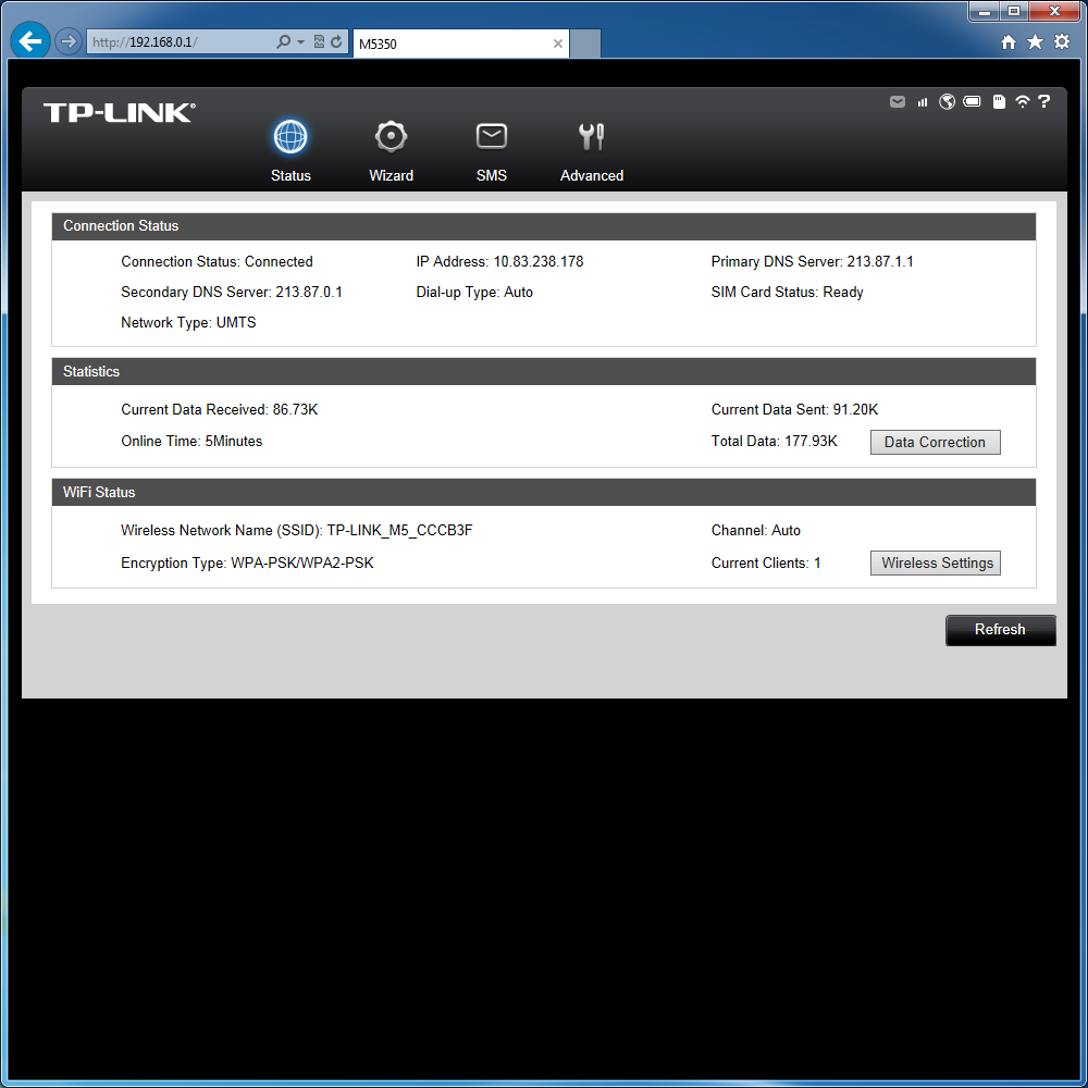В настоящий момент он доступен только на английском языке, но это не должно быть проблемой. Упомянем наличие встроенной справочной системы, что сегодня встречается все чаще. В верхней части окна присутствует статусная строка со значками интерфейсов, карты памяти, батареи, SMS. При первом подключении к web-интерфейсу предлагается использовать помощника для проверки и установки основных параметров для подключения к мобильному оператору и организации беспроводной сети. Отметим, что индикатор уровня заряда батареи ведет себя неадекватно — показания у него очень нестабильные и ориентироваться на него не стоит. Лучше посмотреть на экран роутера.