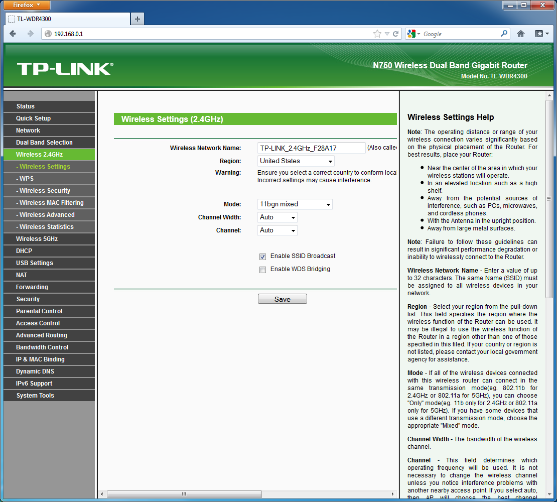 Роутер имеет два независимых радиоблока, что позволяет ему создать одновременно две беспроводные сети. При необходимости, можно работать только в одном диапазоне. Настройки интерфейсов позволяют выбрать регион, ограничить набор стандартов 802.11*, выбрать канал (есть тринадцать в диапазоне 2,4 ГГц и восемь в 5 ГГц), режим 20/40 МГц. Выбор режимов ограничения доступа включает в себя открытую сеть, WEP, WPA/WPA2-PSK и WPA/WPA2 через сервер Radius. Предусмотрен и фильтр MAC-адресов беспроводных клиентов. В дополнительных опциях есть выбор мощности передатчиков, включение WMM, короткого защитного интервала, блокировки прямого обмена данными между клиентами и другие параметры.