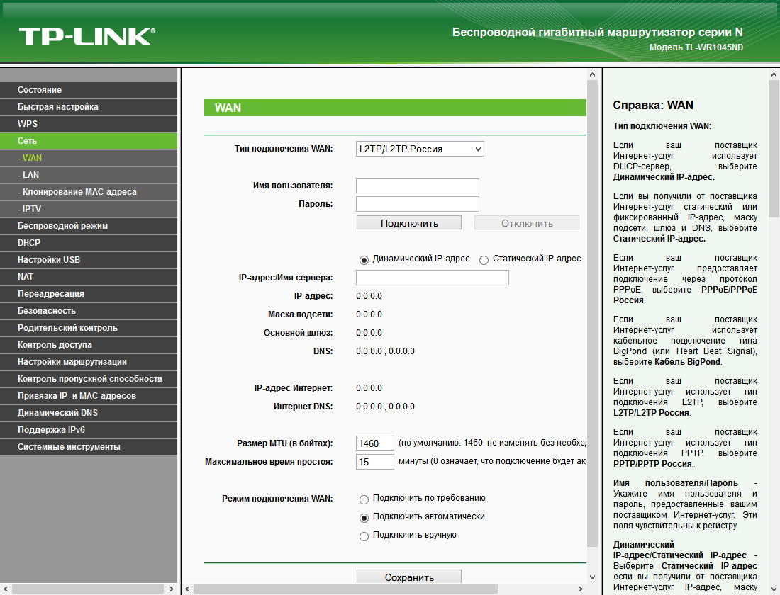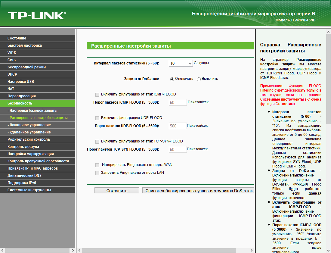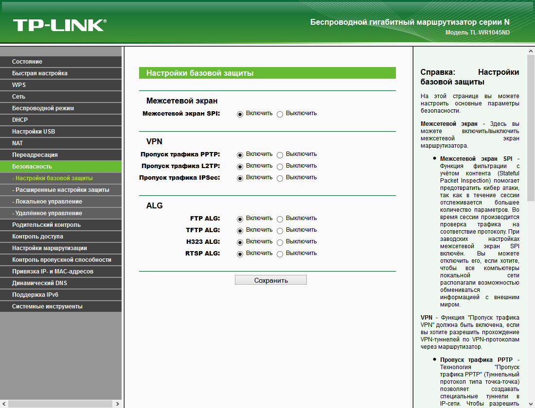 Структура веб-интерфейса характерен для моделей этого производителя — двухуровневое меню в левой части окна, основная страница в центре и справка справа. Дизайн также аналогичен другим устройствам и использует зеленые тона.