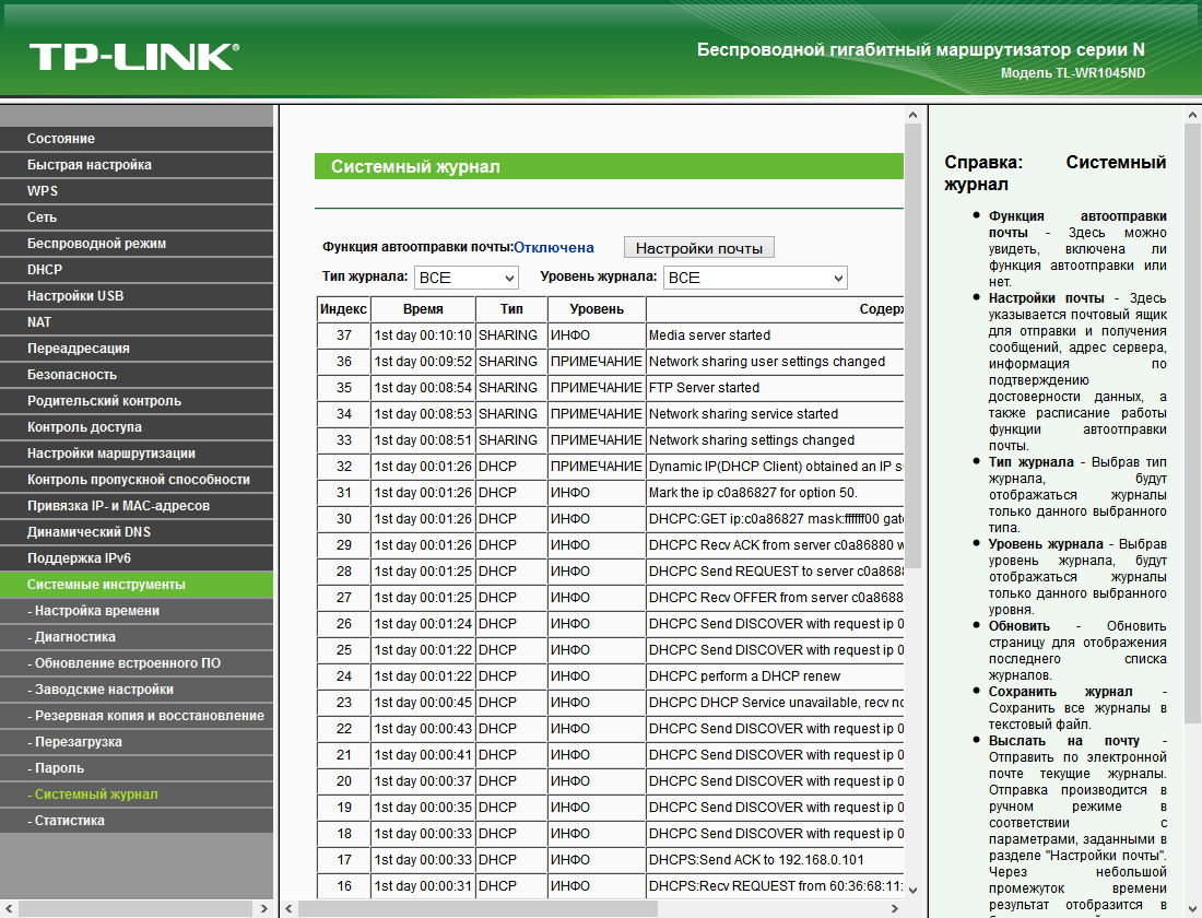 Журнал системных событий достаточно подробный. Для него поддерживается автоматическая отправка по электронной почте. Сервер SMTP потребуется указать в настройках. Дополнительно присутствует сервис подсчета трафика по клиентам. Однако он имеет только ручной режим сброса статистики и не ведет отчета по дням.
