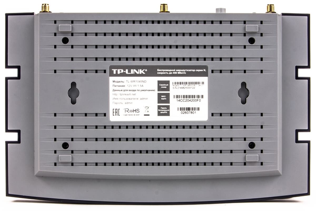 Нижняя часть корпуса использует серый матовый пластик. На ней также предусмотрены отверстия для вентиляции. Ножки у этой модели реализованы просто выступами пластика, что не очень удобно. Зато присутствуют отверстия для крепления на стену антеннами вниз или вверх.