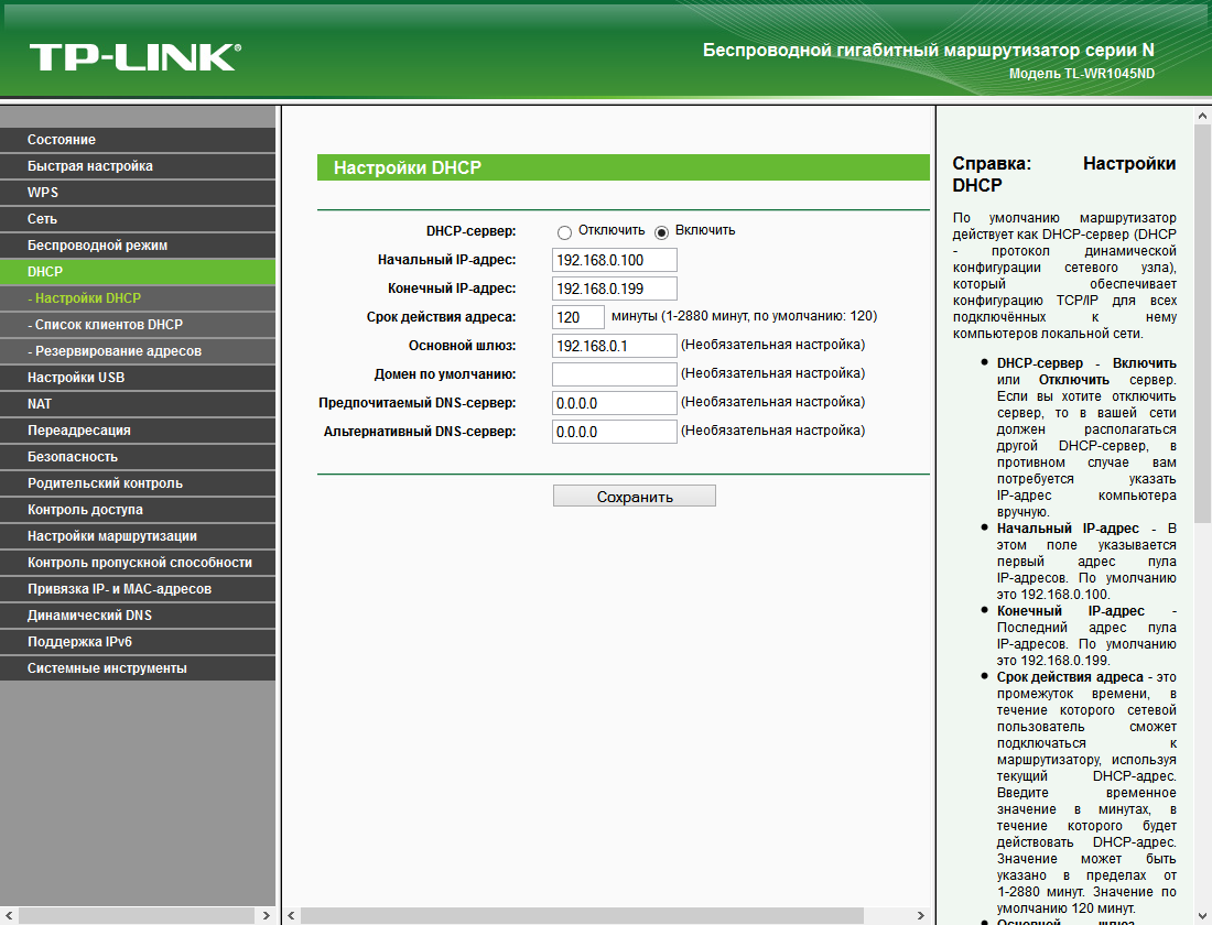 В локальном сегменте сети для упрощения настройки клиентов используется сервер DHCP. Допускается изменение собственного IP-адреса роутера, выбор диапазона адресов и других параметров сервера, резервирование пар MAC—IP и дополнительная привязка адресов в протоколе ARP.