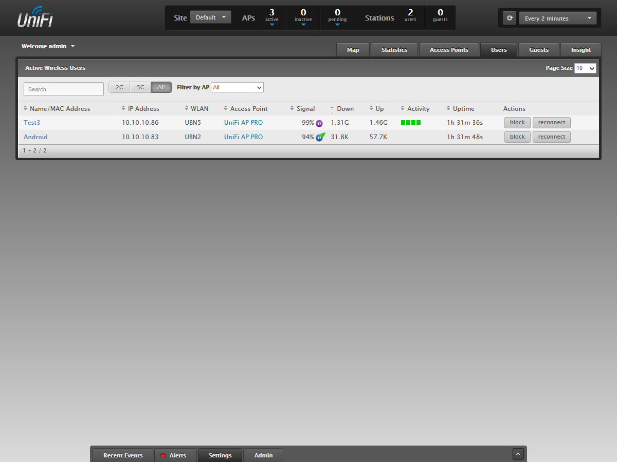 Предусмотрен просмотр информации о подключенных беспроводных клиентов. В таблице указывается имя, адрес, используемая точка доступа, уровень сигнала, тип беспроводной сети, активность, время работы. Есть также поиск и фильтр по точке доступа, а также кнопка блокировки клиента. Аналогичная таблица есть и для гостевых подключений.