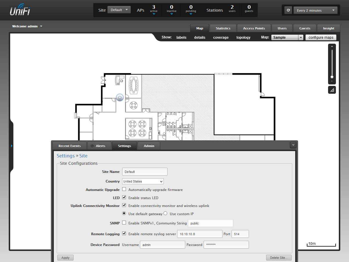 В настройках сайта указывается имя, регион (он будет влиять на режимы работы беспроводных сетей), включается автоматическая загрузка обновлений, отключается индикация на точках доступа, включается SNMP, настраивается отправка событий на внешний сервер Syslog.