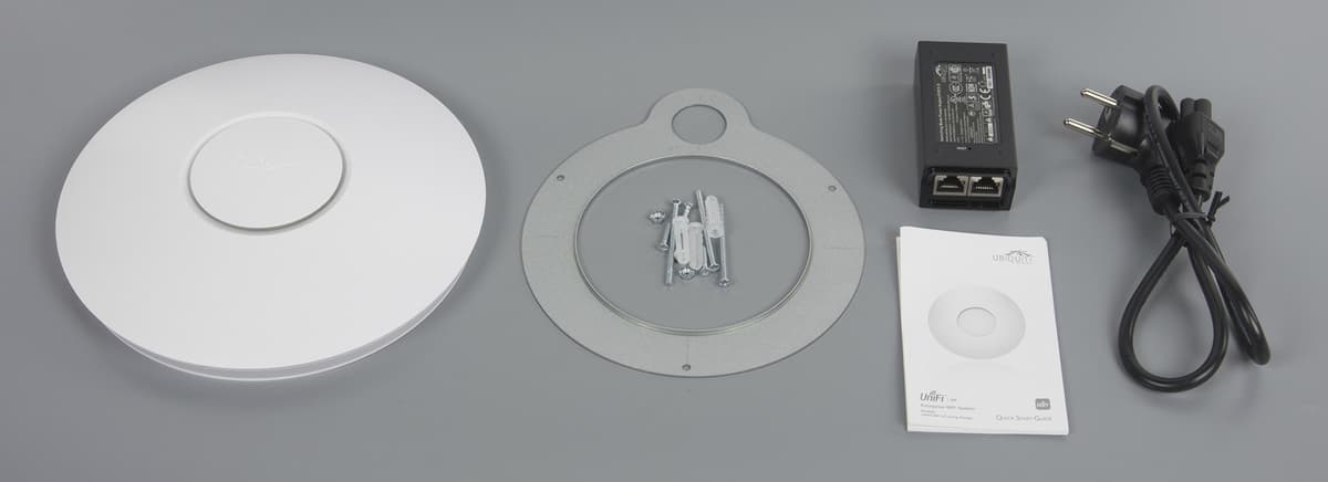Комплект поставки состоит из точки доступа, набора для крепления на стену или потолок, инжектора питания PoE с кабелем, краткой инструкции по началу работы. Отметим, что сетевых кабелей в комплекте нет, что вполне объяснимо позиционированием устройства. Что касается наличия инжектора, то с одной стороны это дает возможность сразу же запустить устройство, однако если у вас уже имеется поддерживающая PoE инфраструктура, получается, что вы немного переплачиваете.
