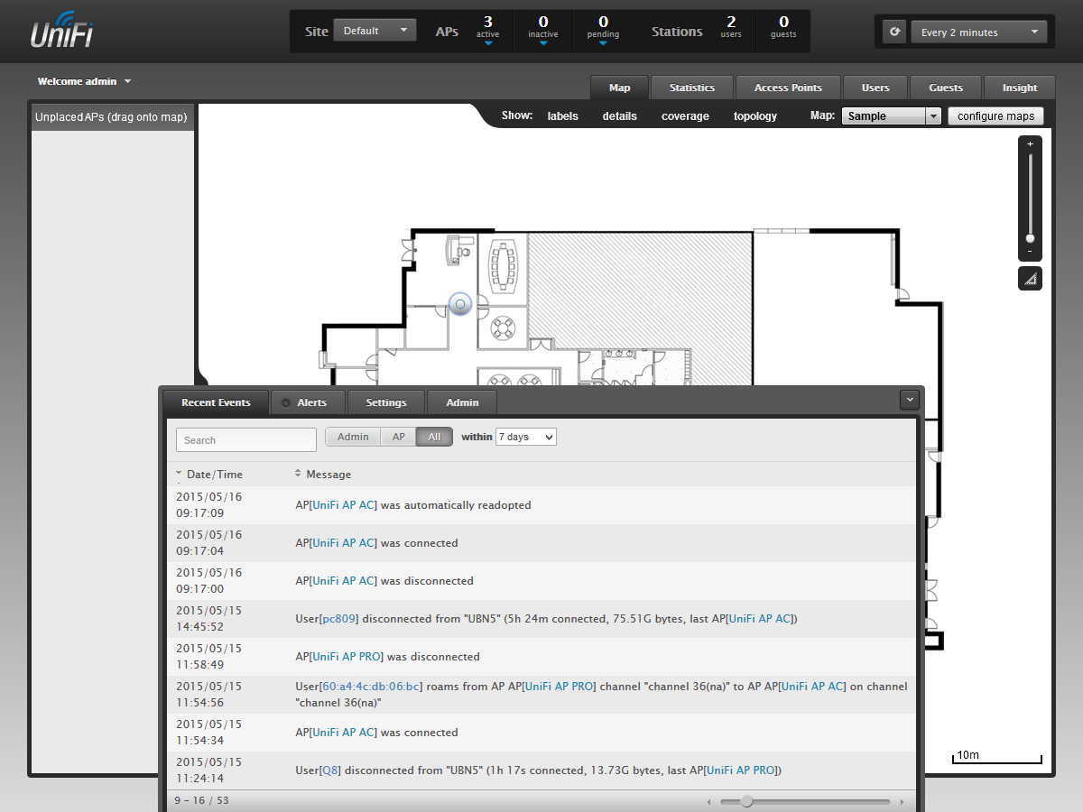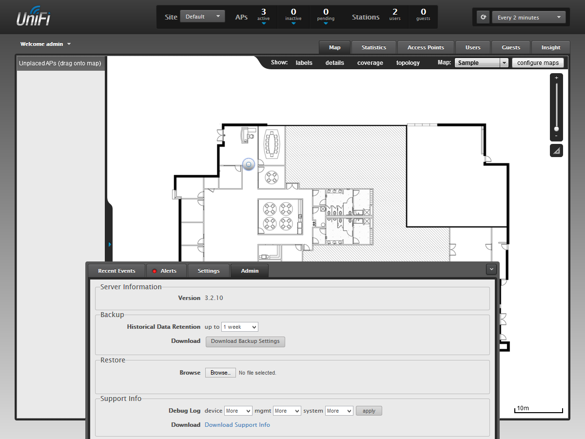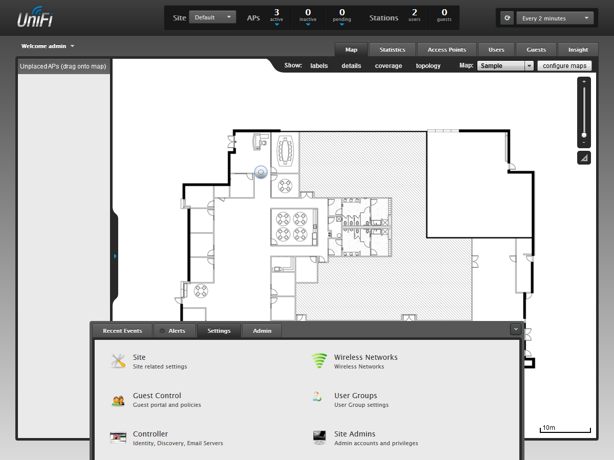Достаточно интересно решен вопрос с настройкой точек доступа. Они не используют традиционного веб-интерфейса, и могут быть настроены через специализированное программное обеспечение — контроллер. Подобный подход позволяет с одной стороны обеспечить совместное управление группами точек доступа, а с другой — сэкономить на аппаратном контроллере. Программа скачивается бесплатно с сайта производителя. Она есть в версиях для Windows, OS X и Linux (последняя распространяется на сайте сообщества), для ее работы требуется наличие Java, а от клиента нужен только браузер и Adobe Flash. Для тестирования использовалась версия 3.2.10 для Windows. Эта же программа используется и для обновления прошивки точек доступа. В тестировании использовалась версия 3.2.10.2886. Отметим, что кроме описанного далее веб-интерфейса, параметры системы можно изменять редактированием внутренних файлов сервиса контроллера (например, для изменения номеров портов). Интерфейс программы не имеет русской локализации, но в данном случае это вполне простительно.