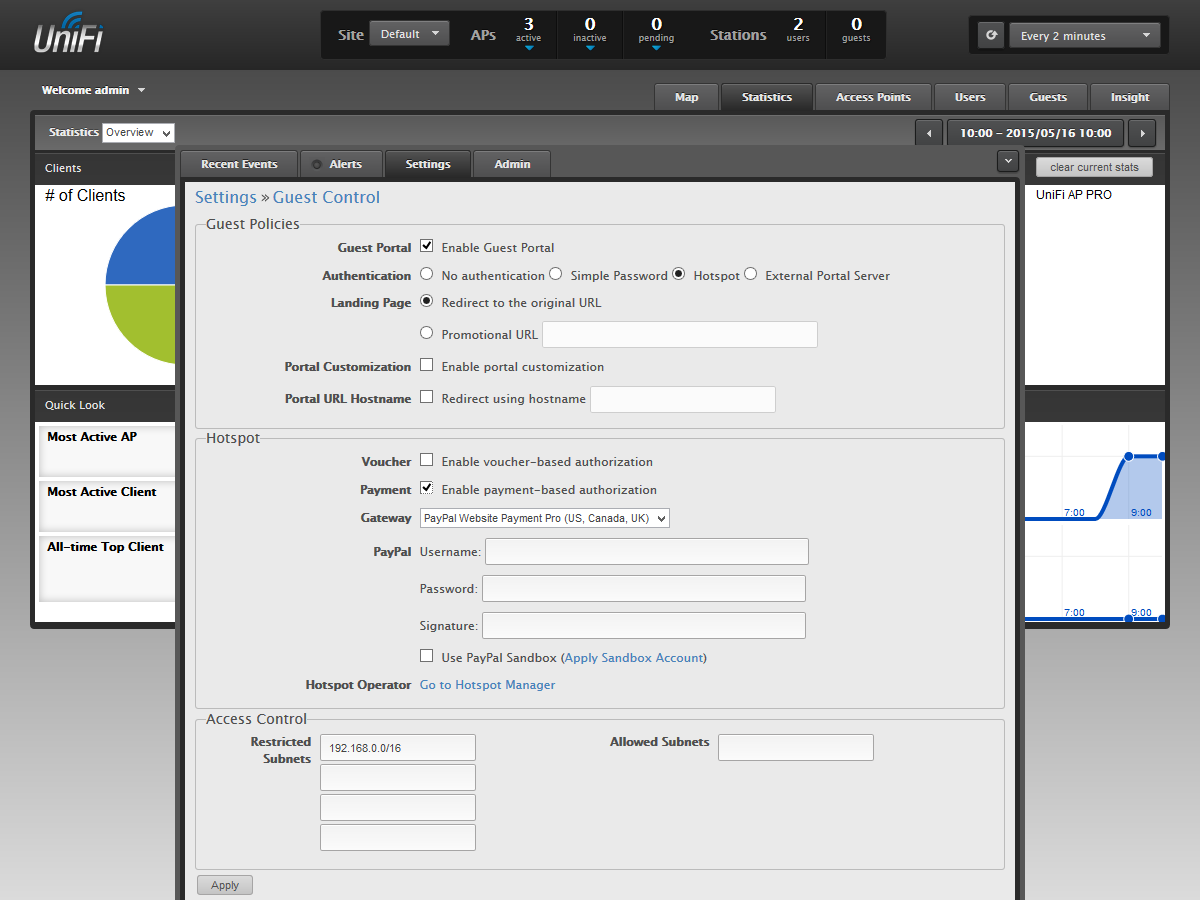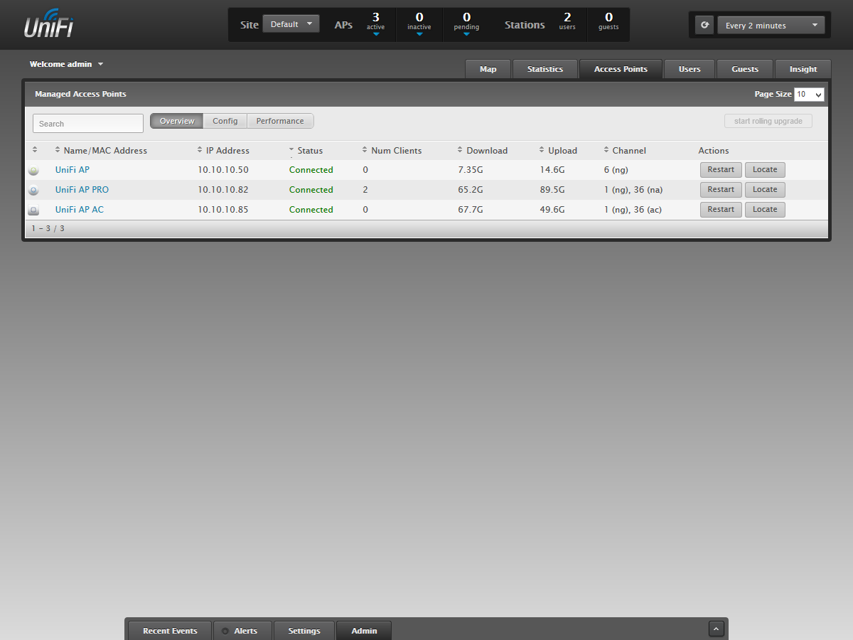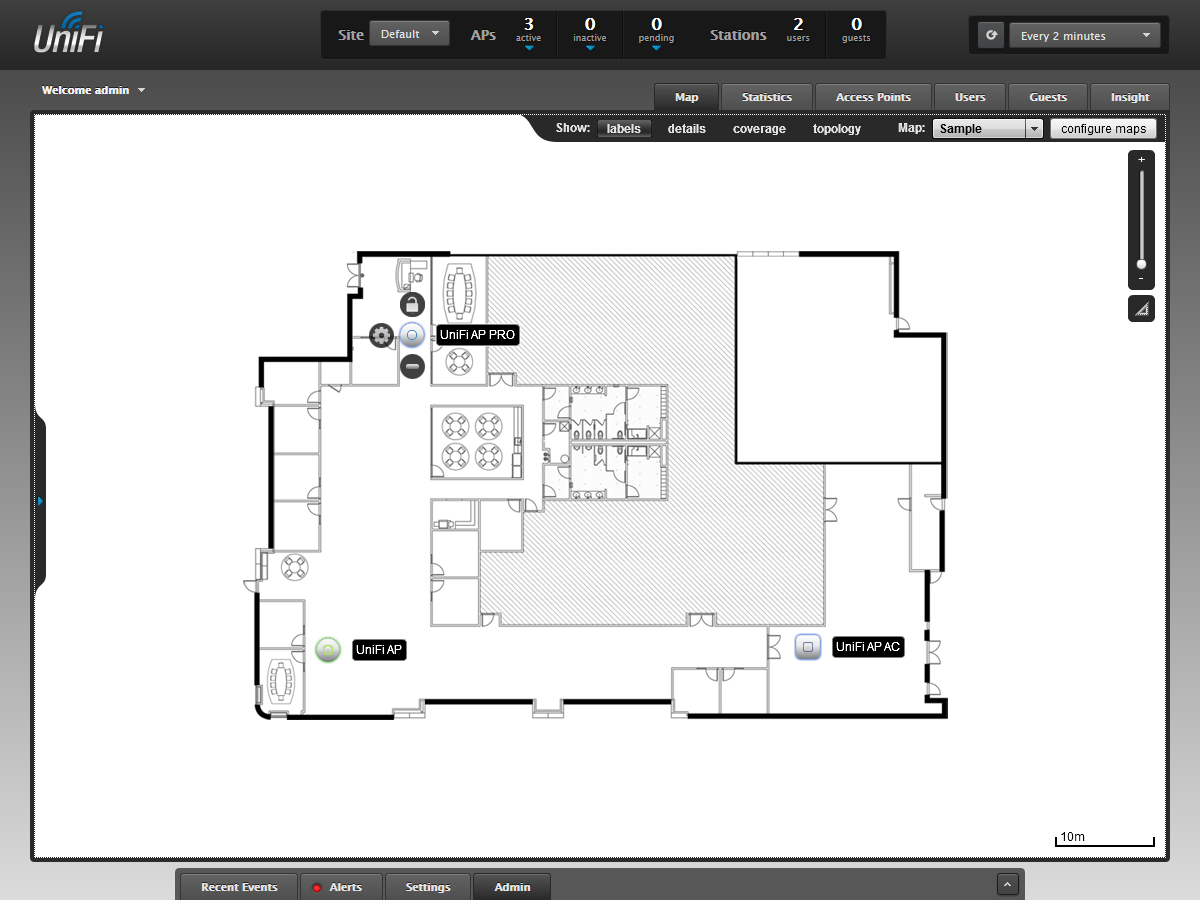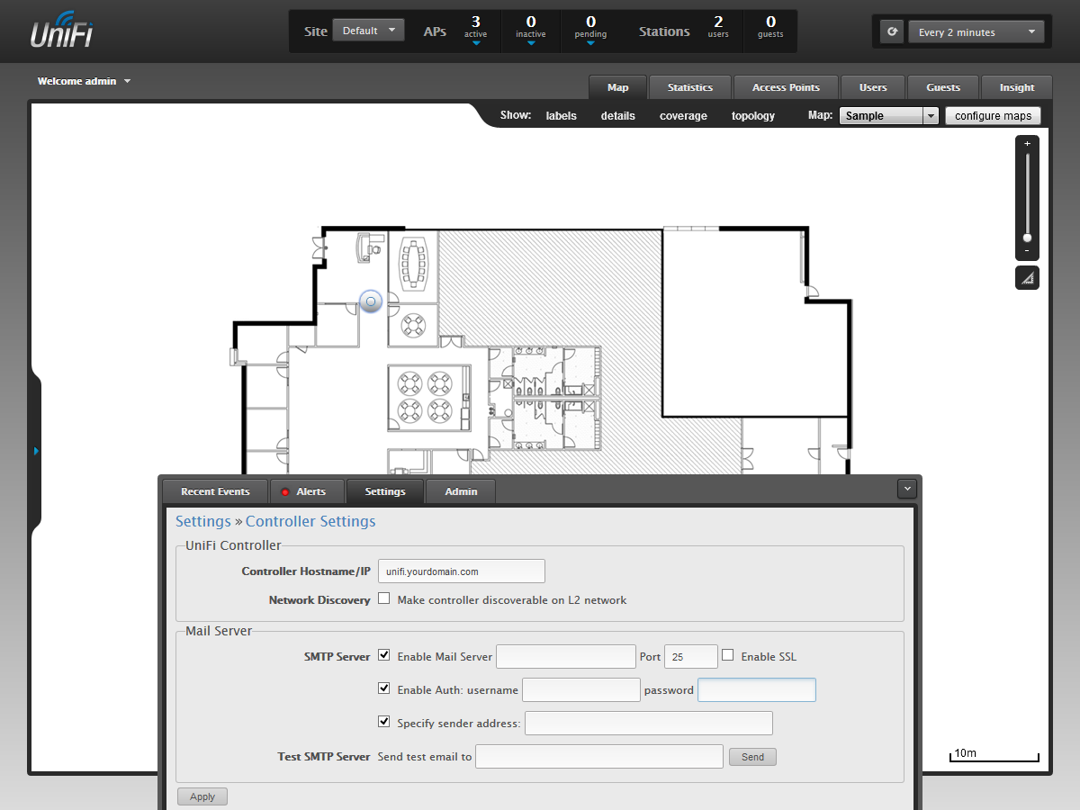 Достаточно интересно решен вопрос с настройкой точек доступа. Они не используют традиционного веб-интерфейса, и могут быть настроены через специализированное программное обеспечение — контроллер. Подобный подход позволяет с одной стороны обеспечить совместное управление группами точек доступа, а с другой — сэкономить на аппаратном контроллере. Программа скачивается бесплатно с сайта производителя. Она есть в версиях для Windows, OS X и Linux (последняя распространяется на сайте сообщества), для ее работы требуется наличие Java, а от клиента нужен только браузер и Adobe Flash. Для тестирования использовалась версия 3.2.10 для Windows. Эта же программа используется и для обновления прошивки точек доступа. В тестировании использовалась версия 3.2.10.2886. Отметим, что кроме описанного далее веб-интерфейса, параметры системы можно изменять редактированием внутренних файлов сервиса контроллера (например, для изменения номеров портов). Интерфейс программы не имеет русской локализации, но в данном случае это вполне простительно.