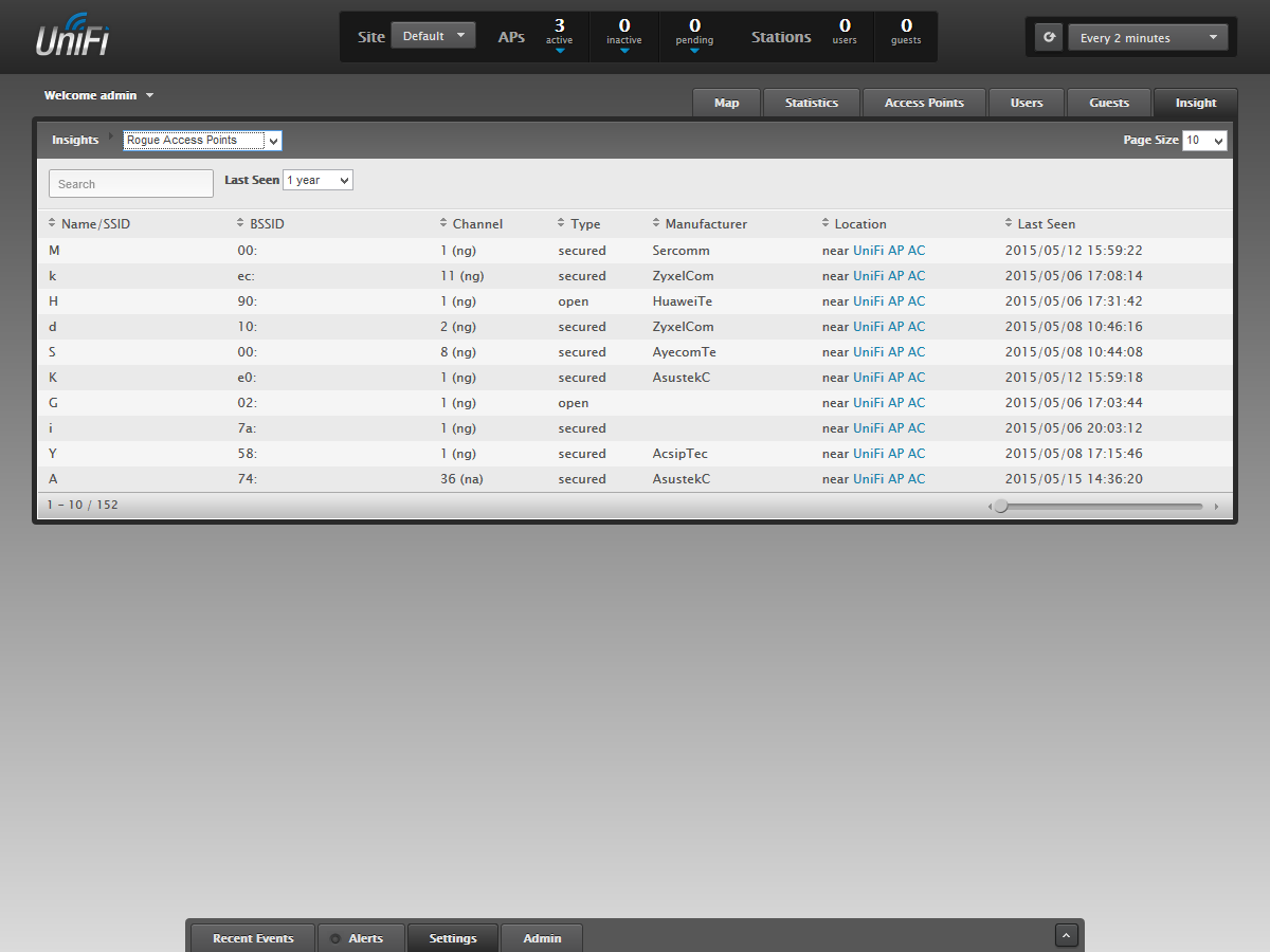 Интересно выглядит вкладка «Insight». На ней можно просмотреть четыре списка — известные беспроводные клиенты, чужие беспроводные точки доступа (к сожалению, без указания уровня сигнала), последние подключения и последние авторизации гостей. Предусмотрен выбор глубины или даты отчета, поиск и разные варианты группировки. Штатных способов автоматизации получения и обработки этой информации не предусмотрено.