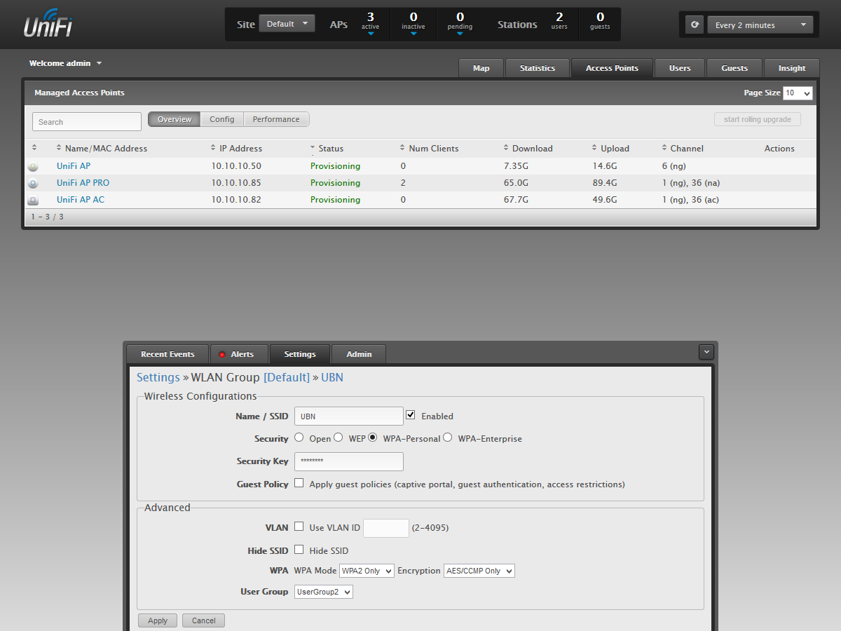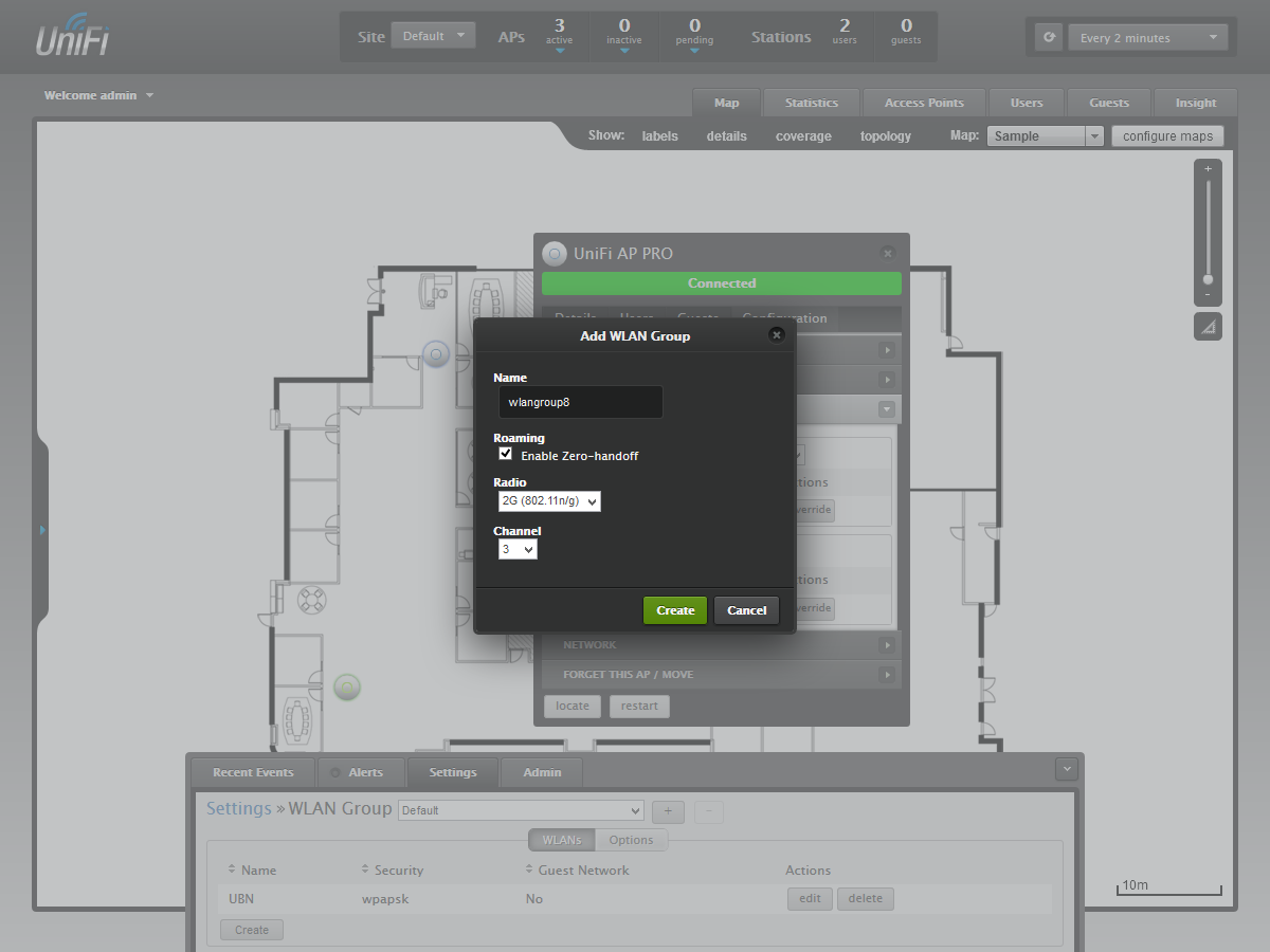На каждом сайте можно организовать несколько групп беспроводных сетей. Для групп доступные такие возможности как балансировка клиентов между точками доступа или Zero Handoff, позволяющий клиентам прозрачно переподключаться с одной точки доступа на другую без какого-либо перерыва связи. На момент проведения тестирования, UniFi AP AC не поддерживала данные возможности. Каждая точка доступа (точнее каждый ее радиомодуль) может принадлежать только к одной группе беспроводных сетей.