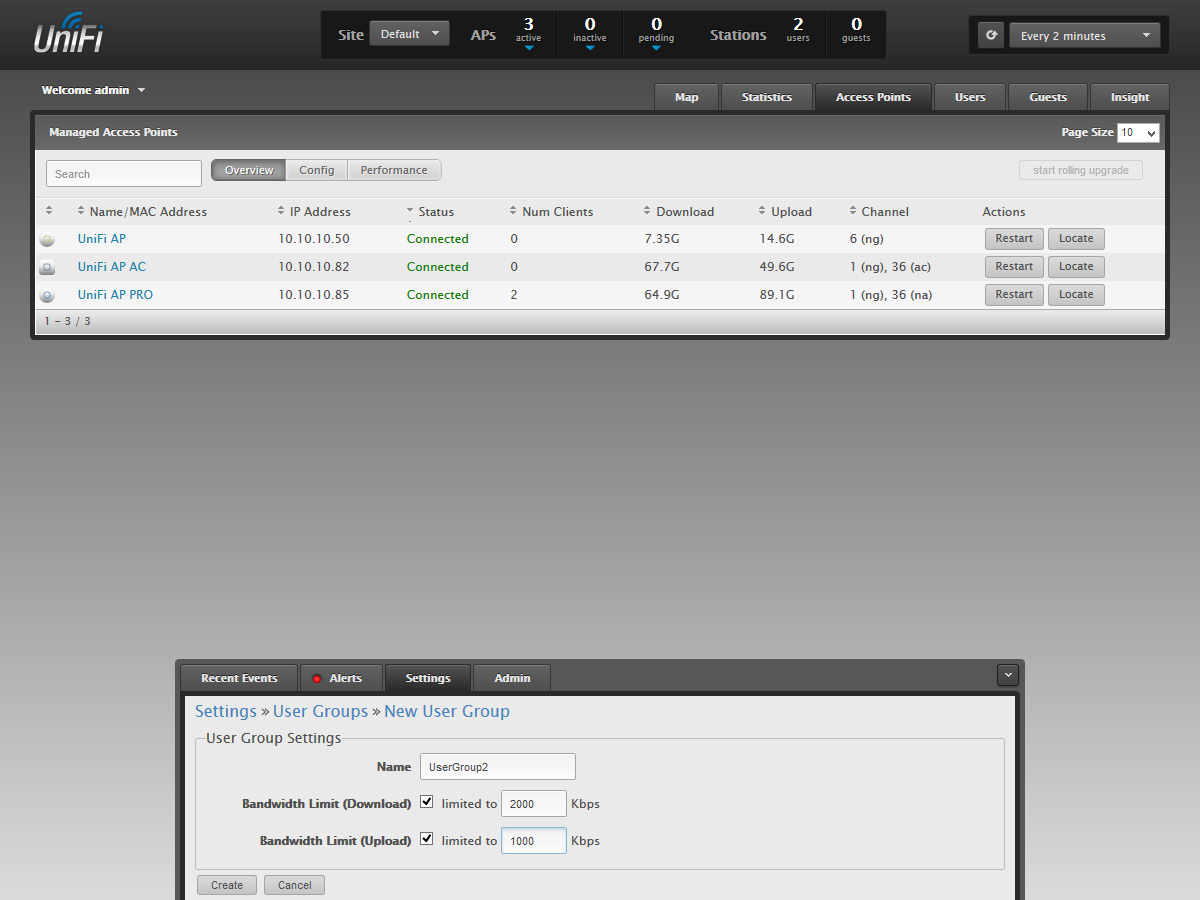 Одной из важных задач при организации беспроводной сети с большим количеством клиентов является обеспечение доступности полосы пропускания независимо от уровня сигнала и других параметров. В рассматриваемом продукте эта функция реализована через так называемые группы пользователей. В их параметрах можно ограничить скорости загрузки и отправки данных. После создания нужных профилей, они назначаются на нужные беспроводные сети. Второй вариант — назначение группы для определенных пользователей (клиентов). Но для этого способа они должны быть известны контроллеру.