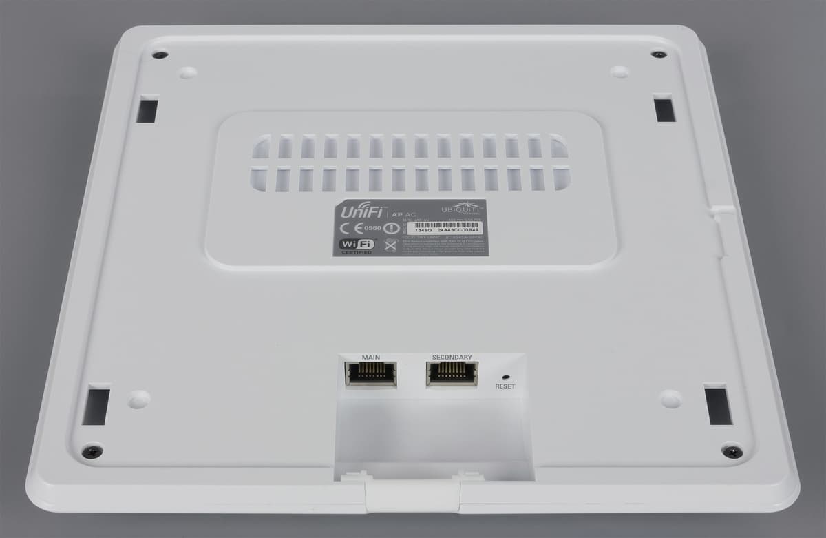 Модель оборудована двумя гигабитными сетевыми портами. Разъемы находятся в специальной нише, рядом с ними можно заметить скрытую кнопку сброса настроек и перезагрузки. Кабели лучше всего вывести под точку доступа прямо в стену, но есть и закрытая резиновой заглушкой выемка на краю корпуса.