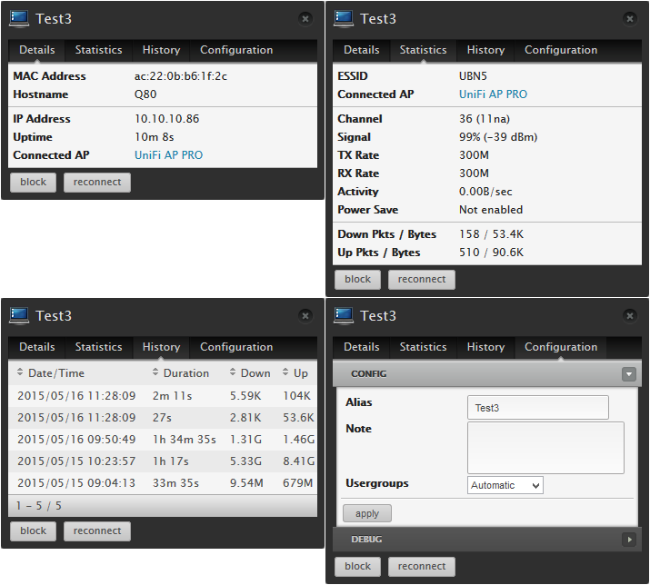 Аналогичное по дизайну контекстное меню есть и для клиентов. В нем можно уточнить их MAC-адрес, имя, IP-адрес, время и точку подключения, уровень сигнала, скорости подключения, статистику данных (в том числе и за длительный срок по сессиям). На странице конфигурации можно добавить имя, комментарий и выбрать группу пользователей (для ограничения скоростей). Здесь же находятся кнопки блокировки и восстановления доступа.