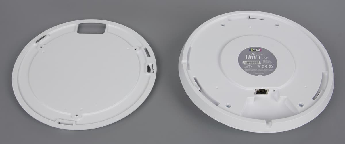 Для установки точки доступа используется комплектное крепление, которое представляет собой круг из пластика с отверстиями для винтов или шурупов и специальными защелками для устройства. В нем также предусмотрена возможность скрытой подводки кабеля к точке доступа.