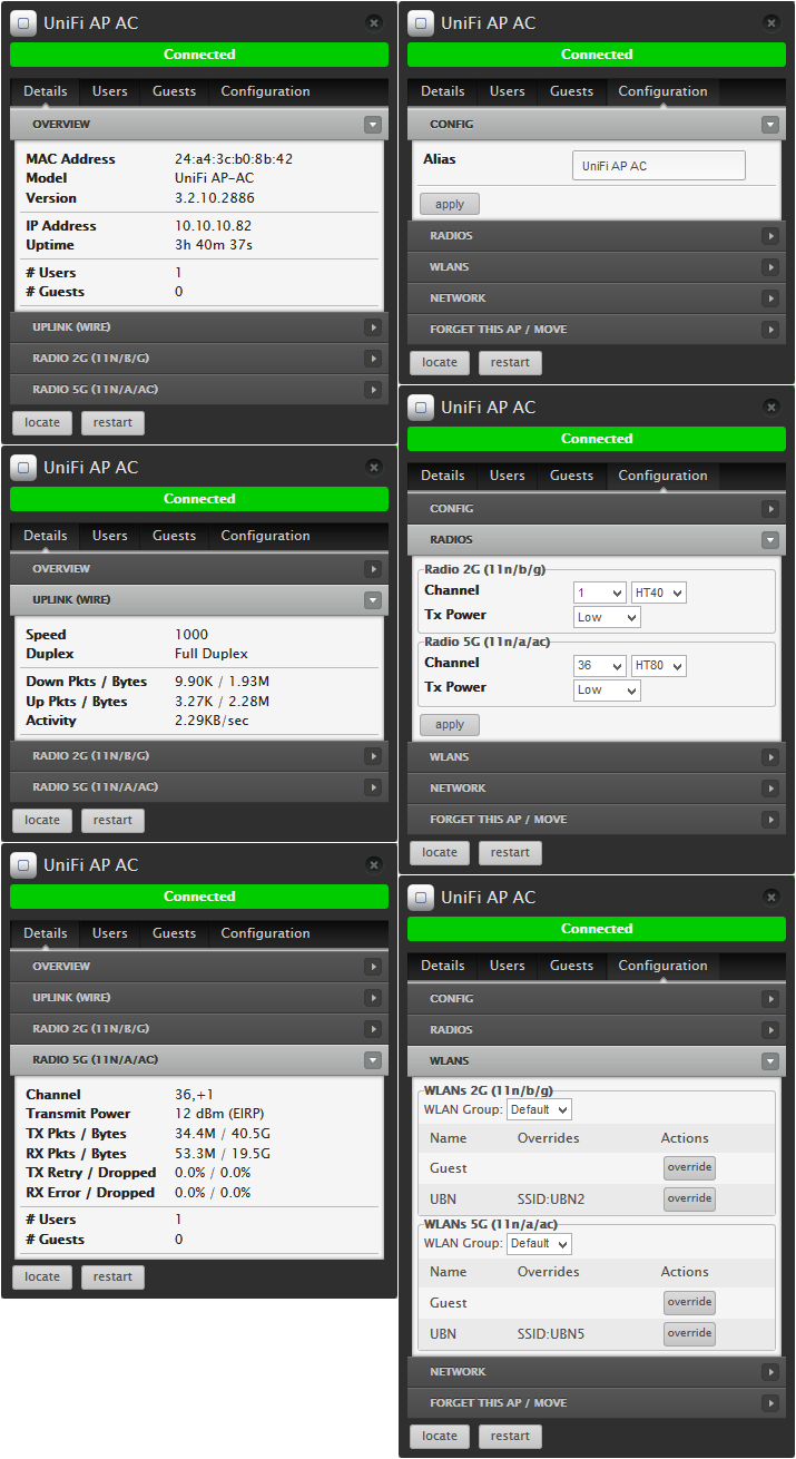 Вкладка «Details» поможет узнать подробности о работе устройства — MAC-адрес, модель, версию прошивки, IP-адрес, время работы, число клиентов, тип и скорость сетевого подключения, рабочие каналы, мощность передатчика, статистику трафика (в том числе и процент ошибок при приеме и передаче).