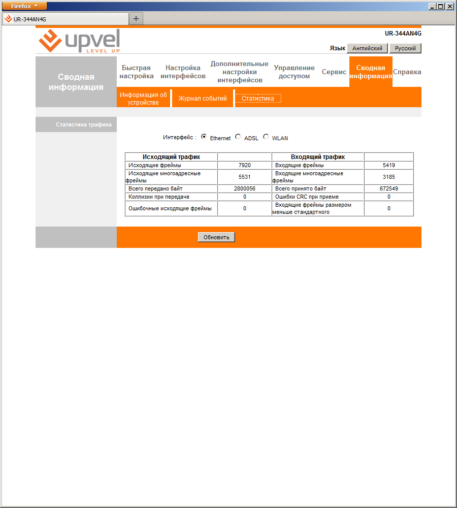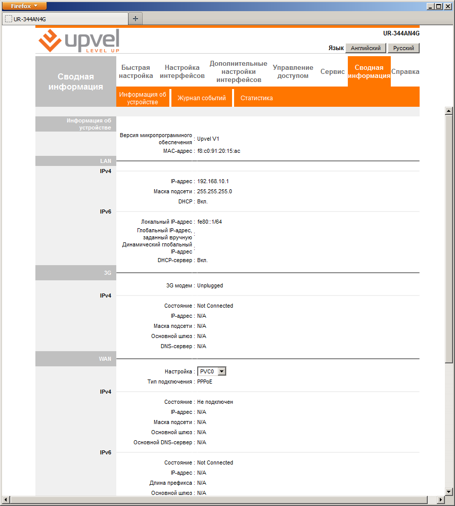 Текущее состояние роутера представлено на страницах раздела «Сводная информация». В частности можно проверить состояние сетевых интерфейсов (кроме Wi-Fi), модема и линии ADSL. Предусмотрено отображение статистики принятых и переданных пакетов по интерфейсам. Обнуляются данные при перезагрузке устройства. Журнал событий достаточно подробный, но пользоваться им не очень удобно (нет перелистывания страниц и очистки, а фильтр работает только по уровню важности). Отправки на электронную почту не предусмотрено, но можно использовать внешний сервер Syslog для хранения информации.
