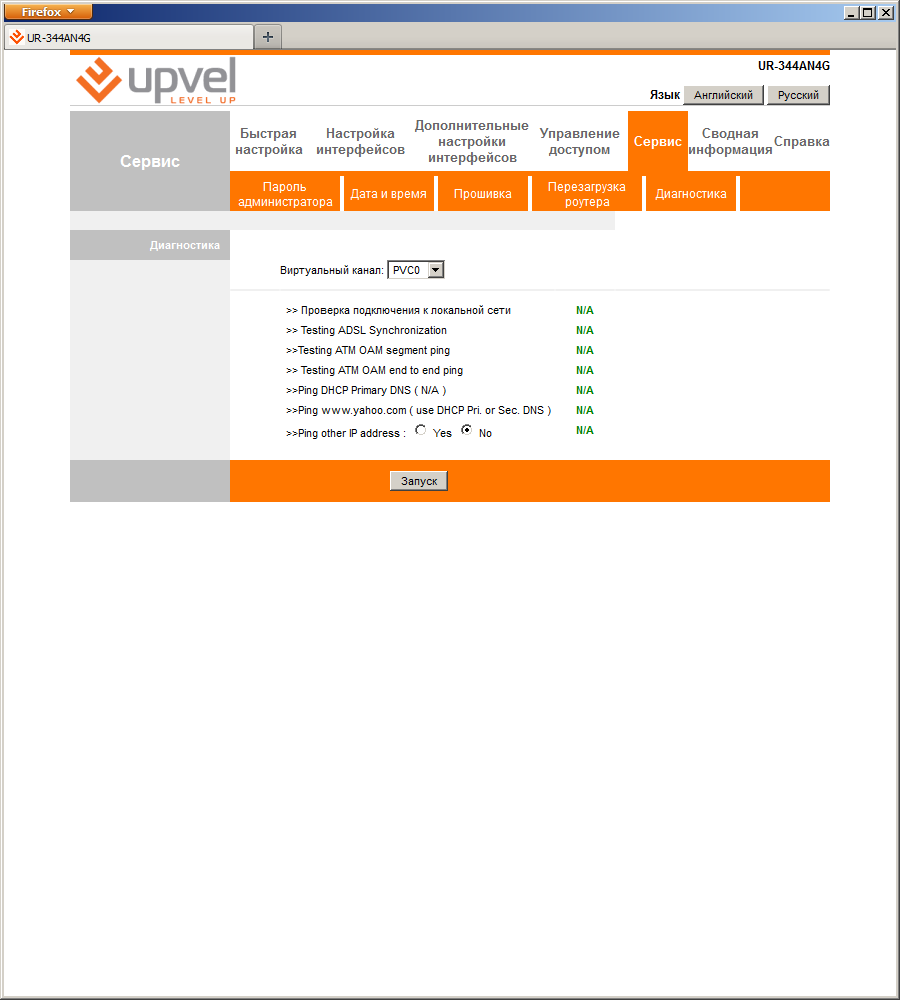 Системные настройки находятся в группе «Сервис». Здесь можно изменить пароль администратора, настроить часы, сохранить/восстановить/сбросить настройки, обновить прошивку, перезагрузить устройство. Также есть пункт диагностики порта ADSL.