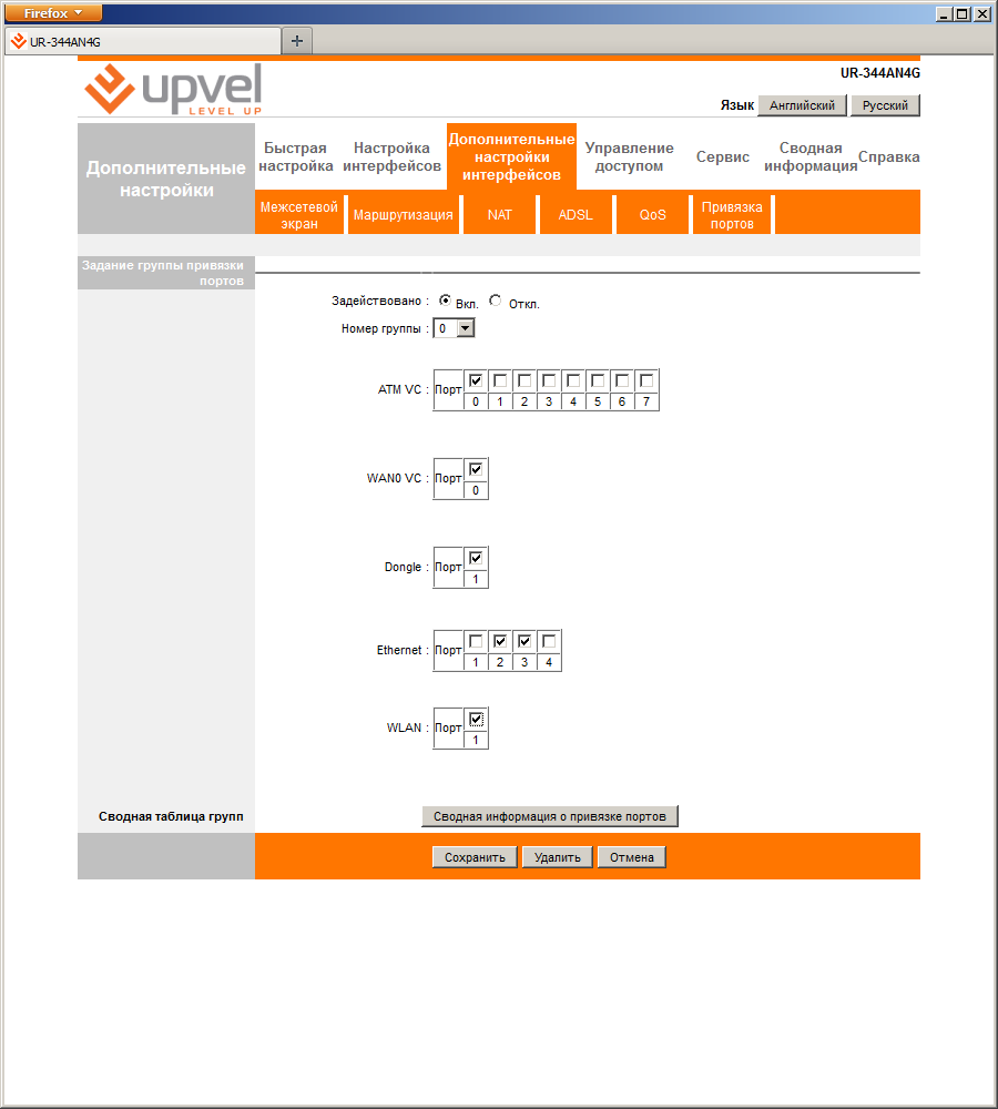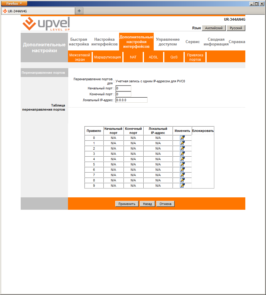 Учитывая, что данной модели может быть несколько внешних интерфейсов одновременно, настраивать трансляцию портов для них можно независимо. Для каждого интерфейса можно настроить DMZ, традиционные правила трансляции портов (до 10 записей, в каждой можно использовать диапазон портов, внешние и внутренние номера портов совпадают) и «переключаемые» порты (до 10 записей).