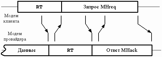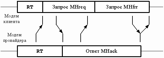 Цифровой модем провайдера детектирует этот сигнал, приостанавливает передачу данных и в ответ выдает сигнал «Tone B», но только на частоте 2400 Гц. В свою очередь, клиентский модем после детектирования ответного «Tone B», вместо выполнения стандартных фаз пересогласования подает запрос «MHreq» о возможности реализации процедуры Modem-On-Hold провайдерскому модему в виде 40-битной специальной информационной последовательности (INFO-последовательности) на скорости 600 бит в секунду с применением фазовой модуляции. В ответ на запрос «MHreq», клиентский модем ожидает от провайдерского подтверждение о возможности выхода в Modem-on-Hold INFO-последовательность «MHack». Получив его, модем инициирует переключение на вторичный звонок путем кратковременного разрыва линии на ~80 миллисекунд (flash). Модем провайдера переходит в режим ожидания начала настроечной комбинации. Если же клиентский модем вместо подтверждения возможности «MHack». получает пакет «MHnack», что означает невозможность осуществления функции Modem-on-Hold, он передает пакет «MHfrr», в ответ на который провайдерский модем инициирует пересогласование модемов для восстановления режима передачи данных (рис 4). Происходит это посредством уже известной функции Quick Connect, для того, чтобы уменьшить время вхождения в связь. Действительно, в данном случае очень уместно применить именно ускоренное вхождение в связь без избыточной оценки параметров канала, так как канал связи разорван не был, а всего лишь произошла приостановка сеанса связи с провайдером.