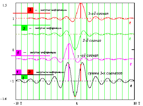 Таким образом, сигналы Найквиста можно передавать один за другим с определенным постоянным интервалом Т. А на стороне приемника, соответственно, принимать их с таким же интервалом. Мгновенные значения сигналов, которые передавались раньше, или которые будут передаваться позже, равны нулю в этой временной точке («0» на Рис. 1), поэтому никаких взаимных влияний между передаваемыми сигналами не существует, несмотря на то, что они передаются один за другим с взаимным перекрытием (Рис. 2).