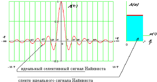 Сигналы, предложенные Найквистом, получили название селективных сигналов. Согласно теории Найквиста, для канала с полосой пропускания от 0 Гц до F Гц можно найти селективный сигнал, обеспечивающий передачу двоичных сигналов без взаимных влияний со скоростью 2F бит/с. Иными словами, в канале, имеющего полосу пропускания от 0Гц до 3100 Гц (так называемый базовый канал, или базовая полоса частот эквивалент по ширине полосы пропускания телефонного канала) можно передавать двоичные данные со скоростью 6200 бит/с, используя селективные сигналы. Спектр любого случайного (по знаку) сигнала такого потока никогда не будет выходить за пределы 3100 Гц.