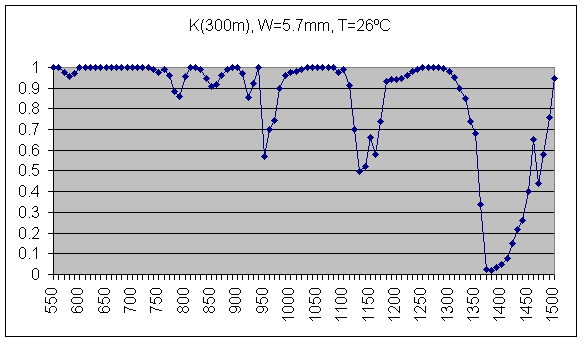 На графике отчетливо видно сильное затухание сигнала в атмосфере для длин волн около 1400 нм. Обратим внимание на частный характер графика, чтобы не было искушения приведенные результаты переносить на другие атмосферные условия в других регионах, т.к. результаты будут существенно различаться.
