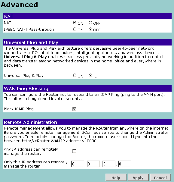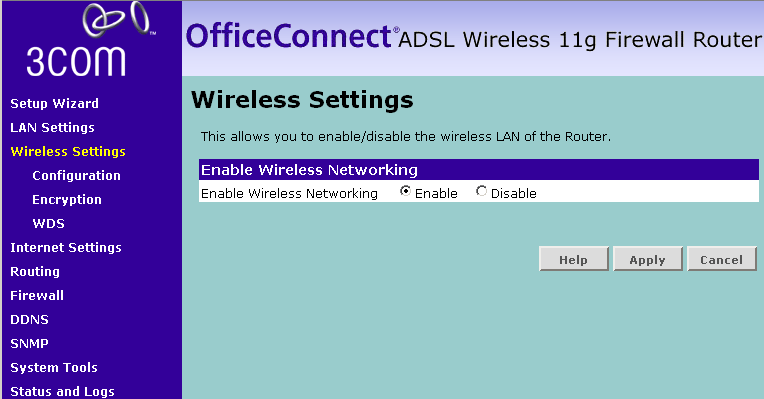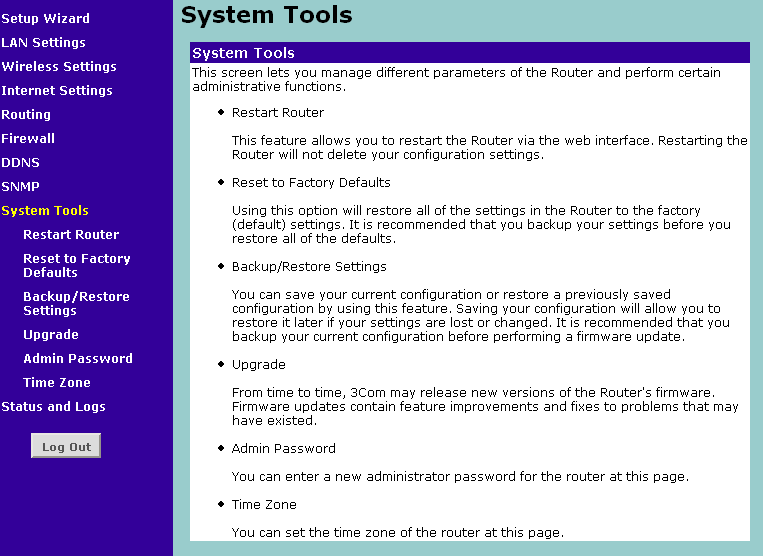 Управление роутером осуществляется через веб-интерфейс, выполненный в традиционной для 3Com гамме и привычным для них расположением элементов меню.