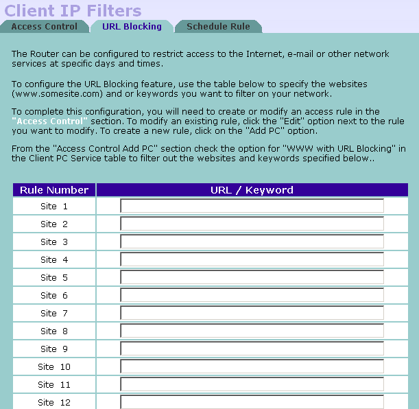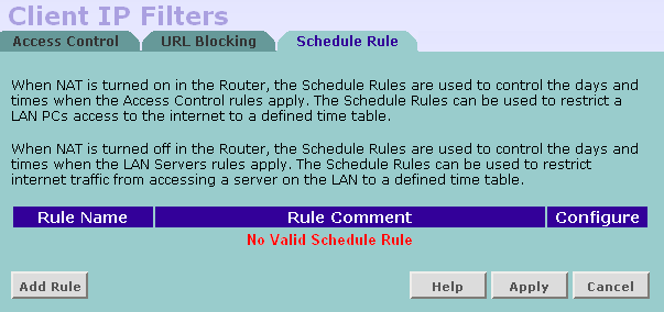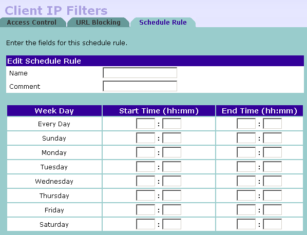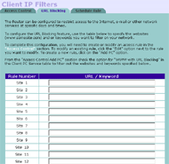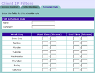 Да, в правилах есть возможность учета времени суток (что умеют далеко не все маршрутизаторы). Но зато возможности по заданию самого правила очень ограничены. Во-первых, можно фильтровать только по исходящему из LAN IP-адресу, то есть, основываясь на адресе клиентской машины. Во вторых — в правиле можно учитывать только порт назначения (протоколов tcp/udp). И в принципе, больше ничего. Правда, еще есть возможность контекстной фильтрации веб-трафика по url/ключевым словам. Но это уже не совсем файрвол.