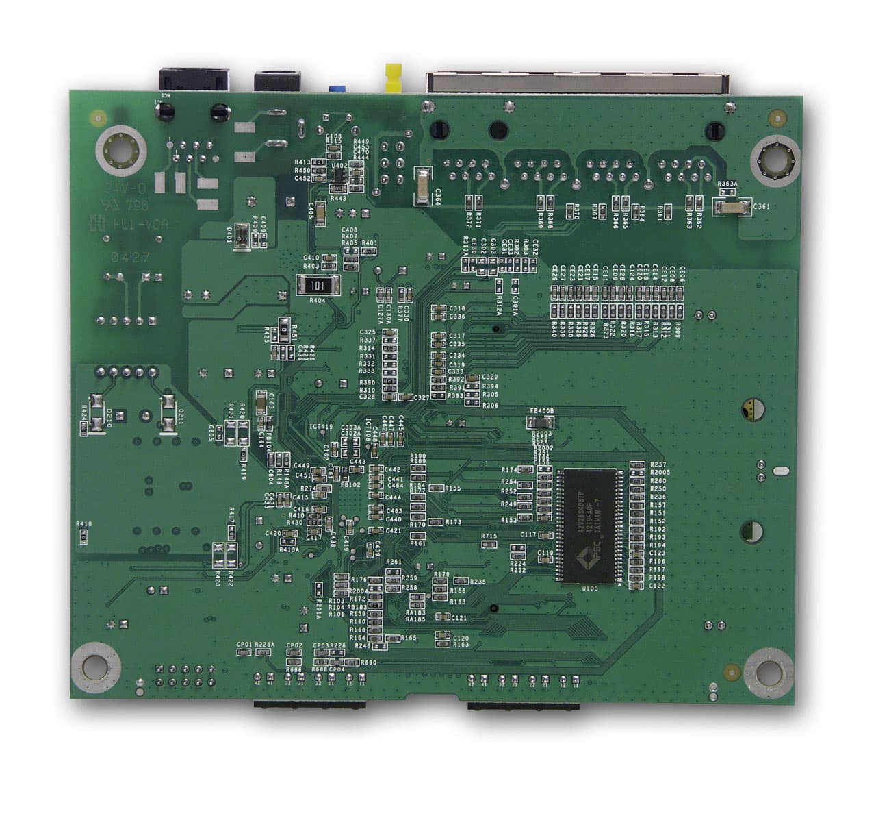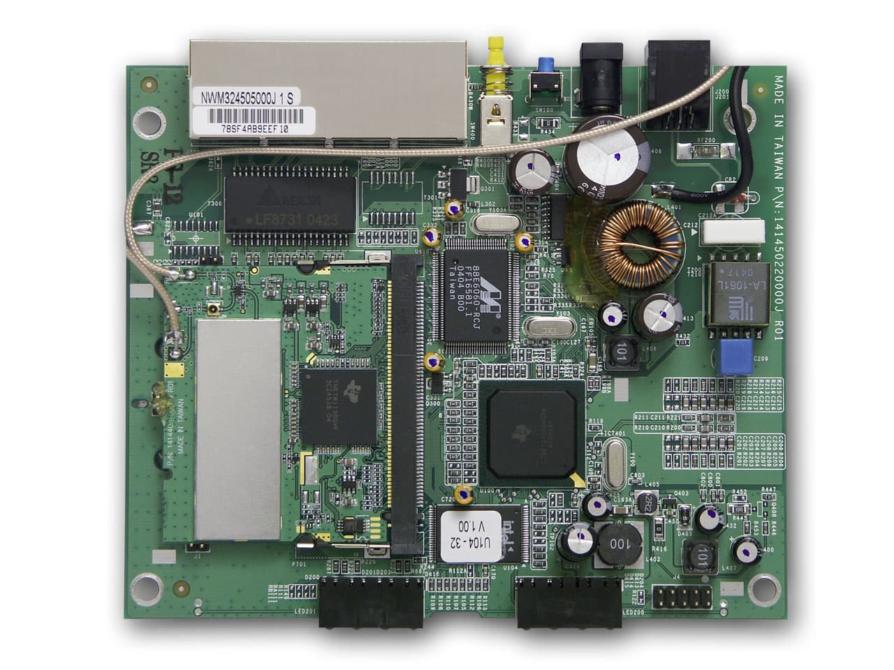 За встроенный коммутатор отвечает контроллер Marvell 88E6060, за авто MDI/MDI-X на портах отвечает микросхема LF8731. Так же на плате расположена микросхем Flash-памяти от Intel и микросхема обычной памяти (с максимальной частотой работы 140 МГц), оба неизвестного объема.