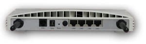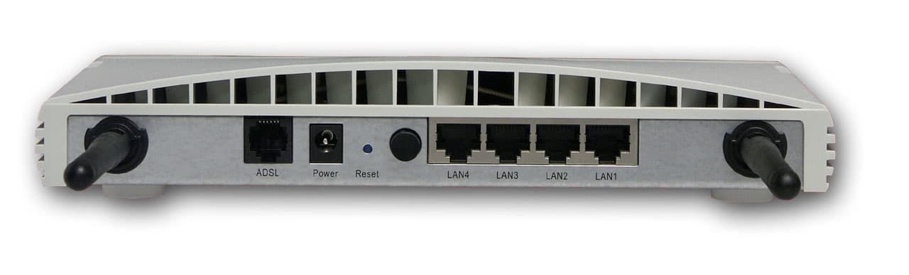 Разъемы на задней панели располагаются в следующем порядке (слева направо): ADSL порт (RJ-11), разъем питания и 4 LAN ethernet-порта. Кроме них, на панели находится кнопка Reset, а так же кнопка выключения питания устройства.
