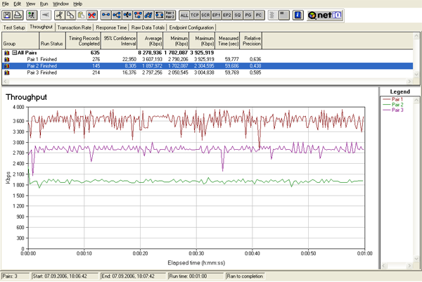 Как видно из графика, между тремя потоками скорость распределяется в зависимости от заданной ширины полосы пропускания канала. Скорости в потоках соответствуют тем, что были получены в первом тесте, где гонялся только один поток трафика.