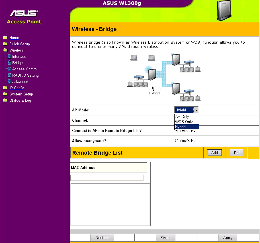 В разделе Wireless Bridge задается режим работы беспроводной части устройства. WL-300g может работать в трех режимах: