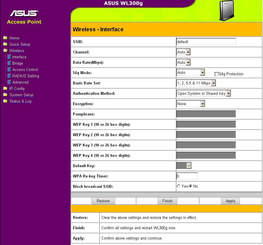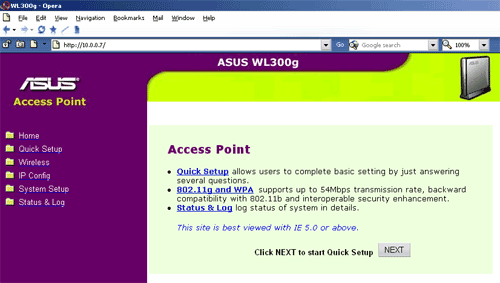 Интерфейс точки доступа повторяет интерфейс беспроводного роутера WL-500b, который рассматривался в статье ASUS WL-500b Wireless LAN Router и Spacelink WL-100 PCMCIA card. Конечно, есть и отличия: во-первых, по умолчанию, отсутствуют настройки файрволов, во-вторых всех дополнительных возможностей WL-500b (ftp сервер, веб-камера и т.д.). Зато все остальные настройки, такие как IP адресация, настройки беспроводного сегмента, обновление прошивки, сохранения конфигурации повторяются практически полностью. Рассмотрю лишь незначительные отличия.