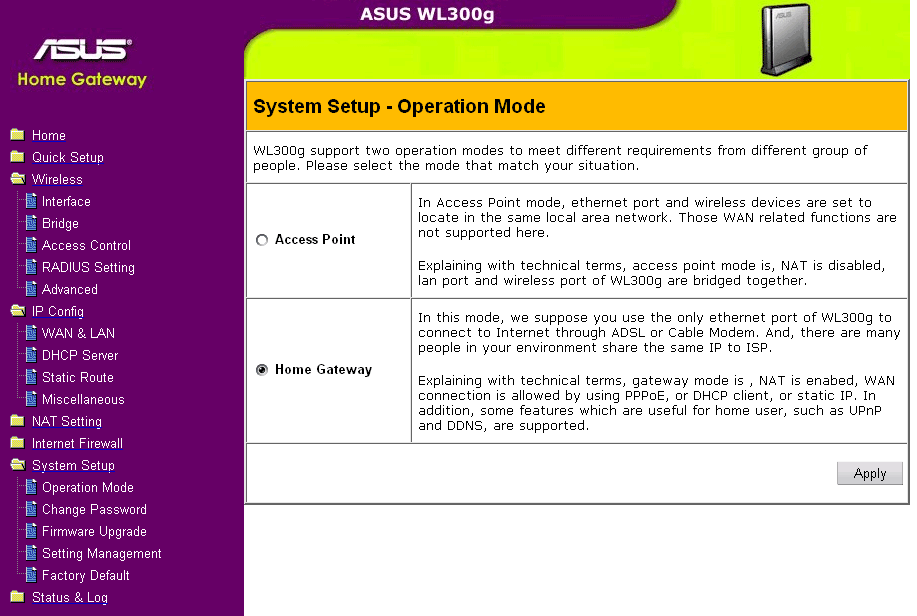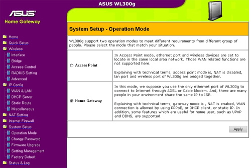 Следующий раздел Operational mode. Это один из самых интересных разделов в нем точка доступа одним элегантным движением (щелчком мыши) превращается в NAT-роутер. В этом случае единственный Ethernet порт превращается в порт WAN и устройство становится NAT-роутером для беспроводных клиентов. Кроме этого, в меню появляется пункт по настройке файрвола (фильтрация пакетов между WAN и Wireless сегментами). Но так как в устройстве присутствует всего один ethernet-порт, то практически невозможно организовать доступ в Интернет для проводных клиентов, используя NAT-возможности WL-300g ведь ethernet порт будет уже занят подключением к провайдеру.