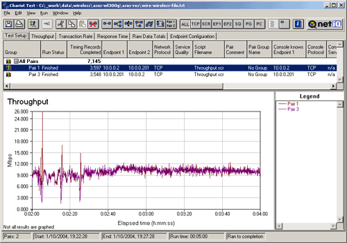 Для тестирования использовался программный пакет NetIQ Chariot. Пакет представляет собой консоль управления (которая может находиться на любом компьютере) и набор сенсоров. Последние представляют собой программы, которые устанавливаются на хостах-генераторах и осуществляют генерацию и мониторинг трафика (по определенным шаблонам). В качестве шаблона генерации использовался шаблон Throughput с жестко заданным временем работы (300 секунд).